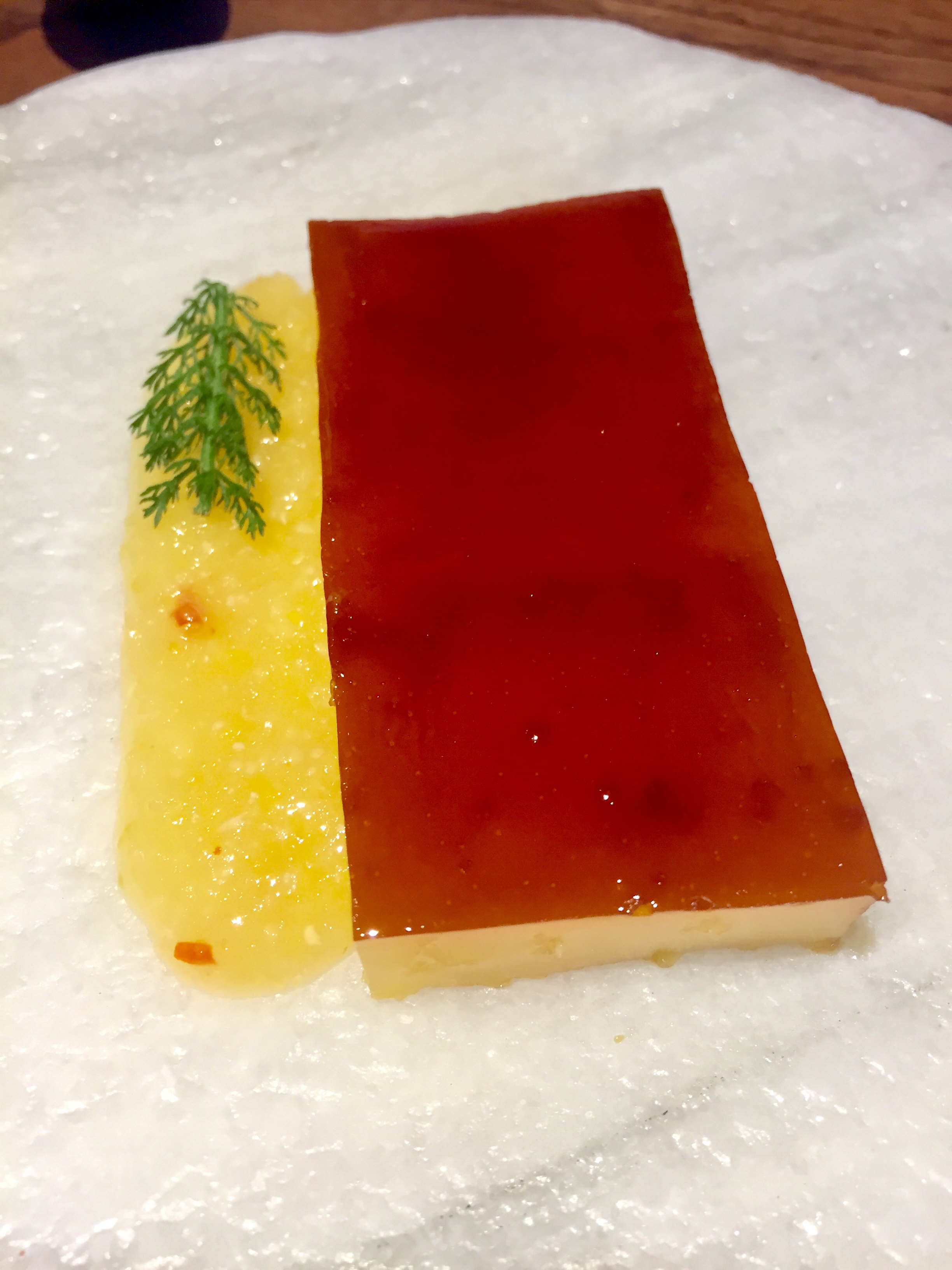 Para empezar los postres, un bello encaje de albahaca, albaricoque, cilantro y limón que sabe thai y da pena comerse. Y digo que sabe a tailandés porque el chef hace mucho que tiene postres con esos toques refrescantes y aromáticos que dan el cilantro, el curry verde o el lemongrass y que nada tienen que ver con los postres españoles. Este era una belleza sabrosa que me hizo recordar aquellas bolitas de helado de cilantro que tenía la versión anterior.