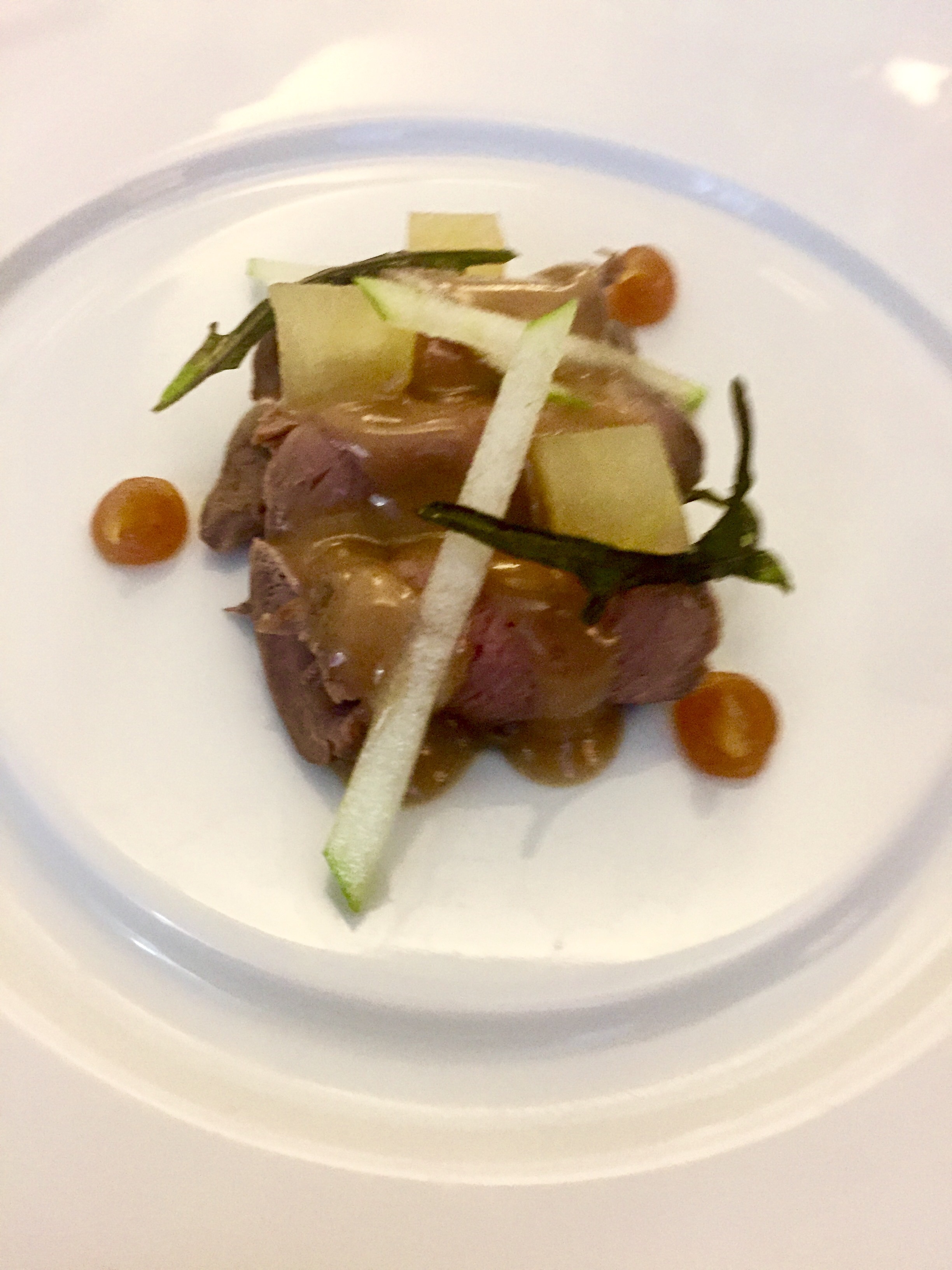 El lomo de corzo asado tiene una ternura perfecta y un punto admirable. Aterciopelada y cremosa salsa de caza y las mismas guarniciones en ambos platos: cremas de manzana y frutos rojos y una espléndida lombarda. Además un puré de patata que nada tiene que envidiar al famoso y muy cremoso Robuchon.