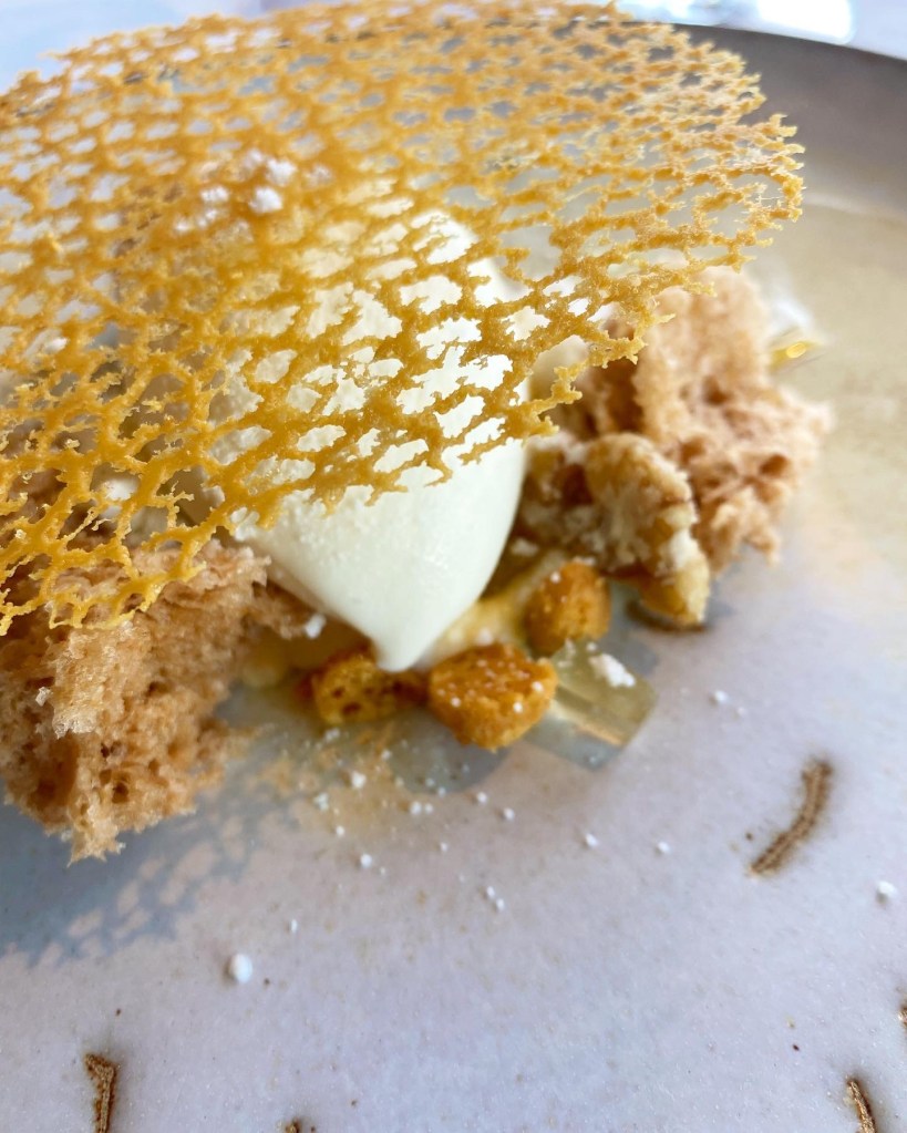 Después, una de sus genialidades, esas que nos hacen decir: esto por qué no se le había ocurrido a nadie. Se trata de straciatella con un chorro de aceite, yemas de erizo y un poco de caviar. Impresionante. Los sabores fuertes del pescado contrastan a la perfección con la delicadeza del queso, así como de un aceite que lo realza todo. Lo sirve con las delgadísimas y crujientes tostadas marca de la casa.