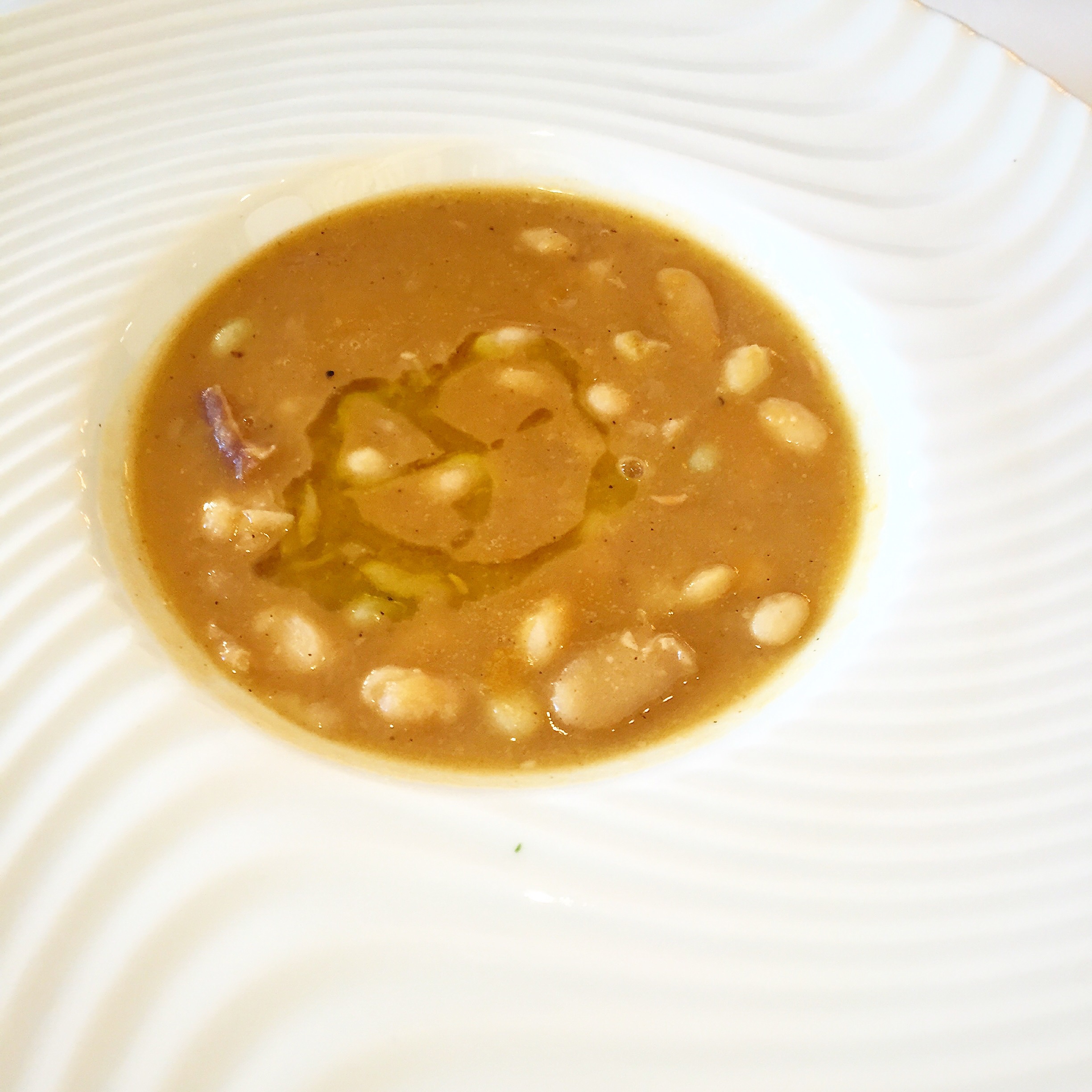 Si en el plato anterior hay sabiduría sin riesgo, ahora pasamos a la audacia total porque lo que empieza siendo un inocente plato de cocochas a la brasa, se convierte en una feijoada por el añadido de frijoles negros, salsa de frijoles y hasta crujiente farofa. Falta la col y la naranja pero hay algo mejor, una heterodoxa espuma de piparras que hermana las alubias negras de la feijoada con las alubias rojas de Tolosa. Una originalidad impresionante y lo mejor… está tan bueno que gustó a gente poco aficionada a las cocochas, que también la hay…