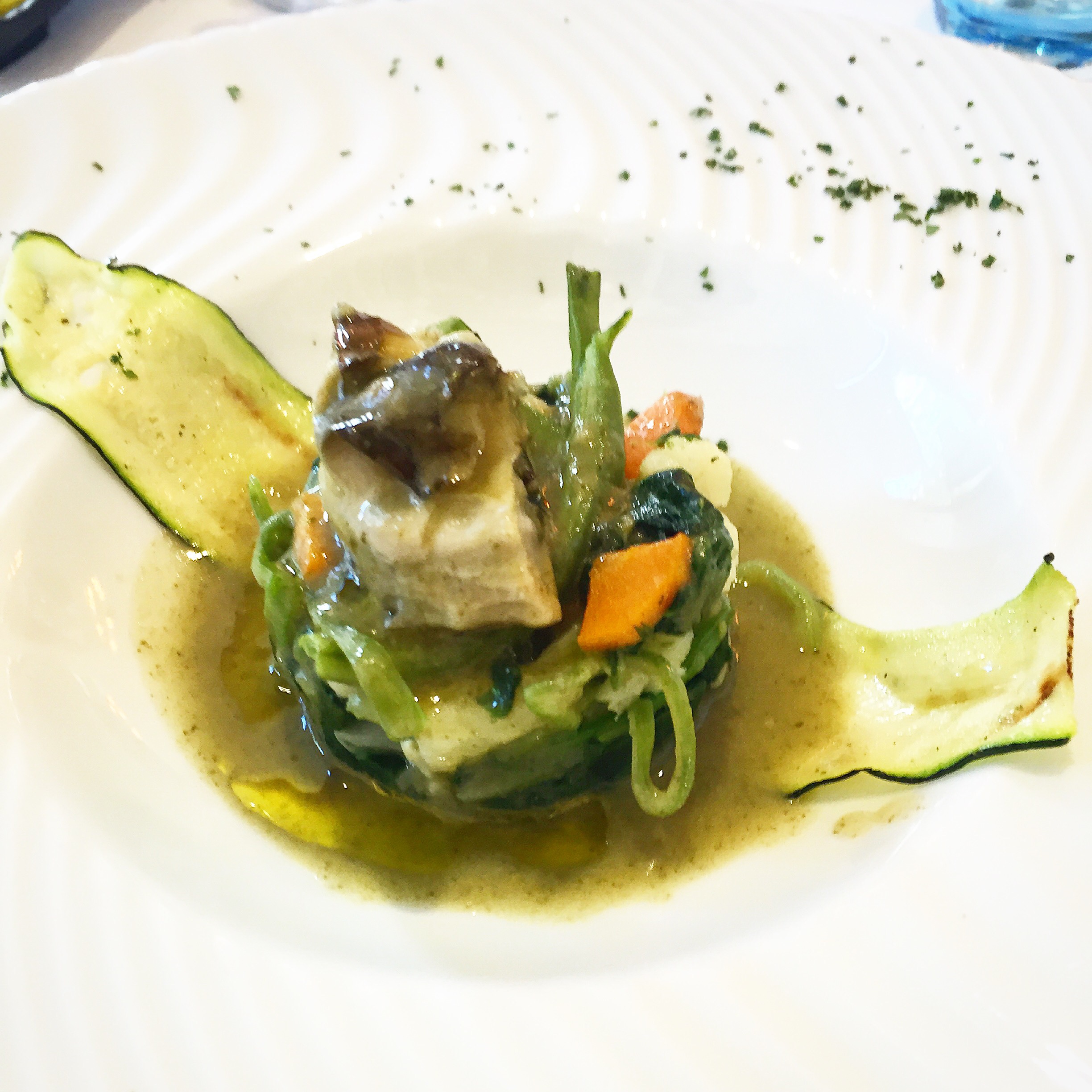 Casi todo el menú ha girado en torno a las verduras y me ha asombrado la calidad y tratamiento de cada una, todas de Mendavia. El pimiento ligeramente picante y relleno de una sutil y delicada brandada de bacalao -normalmente más basta y de muy intenso sabor- se sirve con aceite de cebollino y jugo de pimientos y es un plato para descubrirse. Sabe a todos sus ingredientes gracias a un perfecto equilibro entre sabores que luchan por taparse.