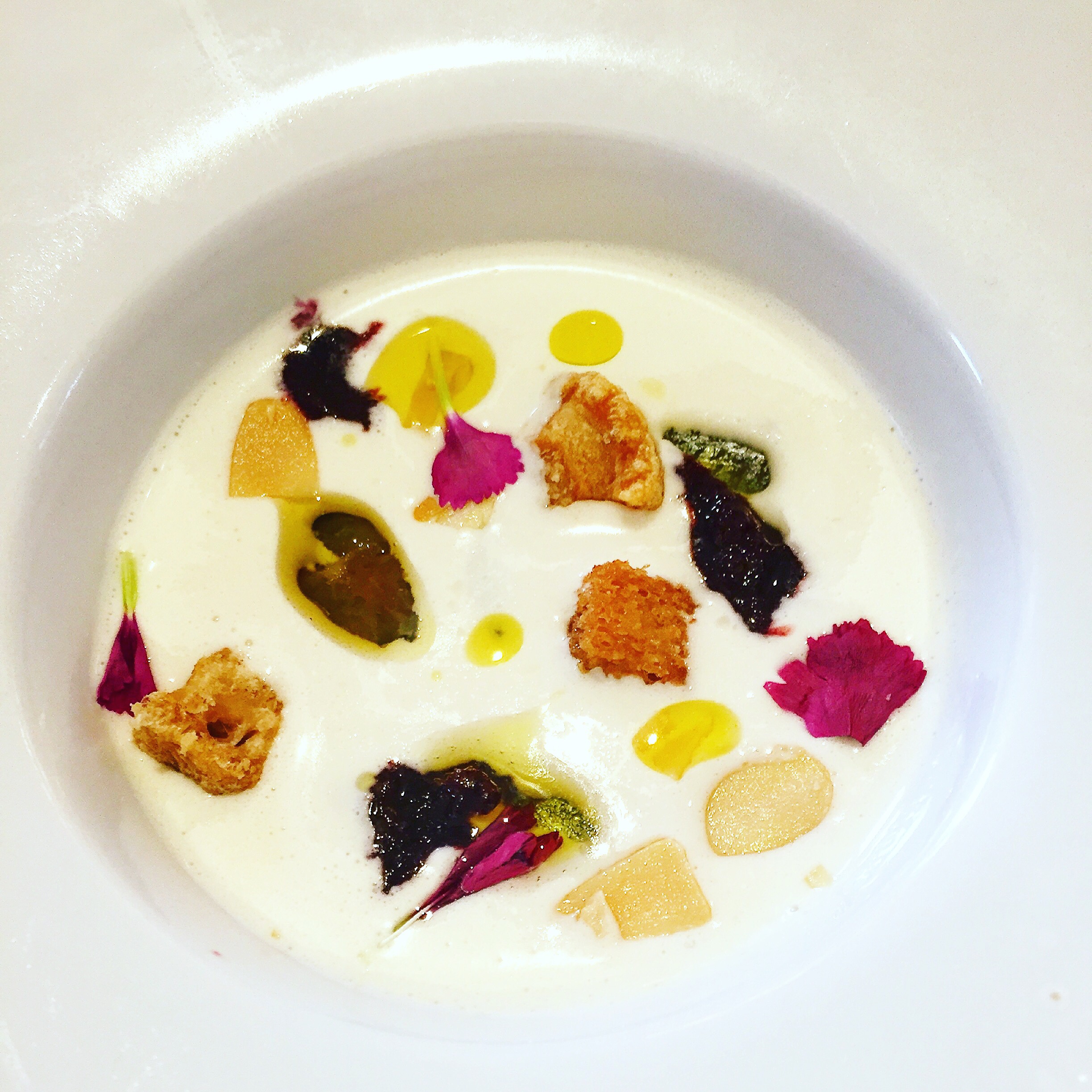 El ajoblanco es realmente bueno. Yo lo llamaría, a la antigua, ajoblanco ilustrado porque se enriquece con sardina ahumada, pétalos, sorbete de tempranillo, torreznos y almendras tiernas. El contraste de cada sólido con la crema es excelente.