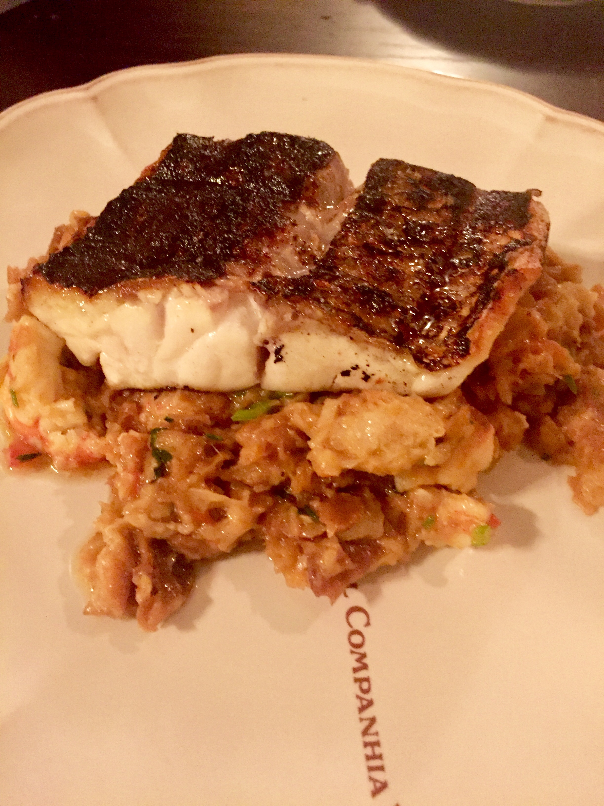 El guiso de bacalao es tradicional de denso pilpil y tiernas judías de Granxet y diferente por sus pequeños ñoquis de chorizo, el limón curado y el precios crujiente de patata que lo recubre, todo bien armonizado y muy suculento.