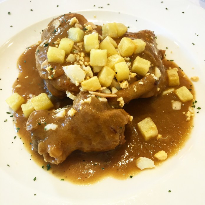 Para su tranquilidad he de decir que el susto pasa rápido y ya no volverá en toda la comida, porque la berenjena abuñuelada con miel de caña es un delicioso bocado muy especiado en el que ningún aroma predomina tanto como para anular o distorsionar el resto de los sabores.
