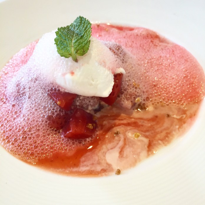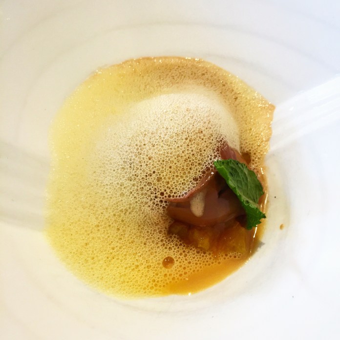 La menestra guisada, yema de huevo emulsionada con mantequilla de maeiz (cabra) ahumada y karkadé (hibiscus) es un buen plato vegetal, fresco, crujiente y alegrado por la mantequilla y el huevo. La presentación no es tan bella como las otras pero pronto verán que ello es una excepción porque, ya se ha dicho, esta es una bellísima cocina.