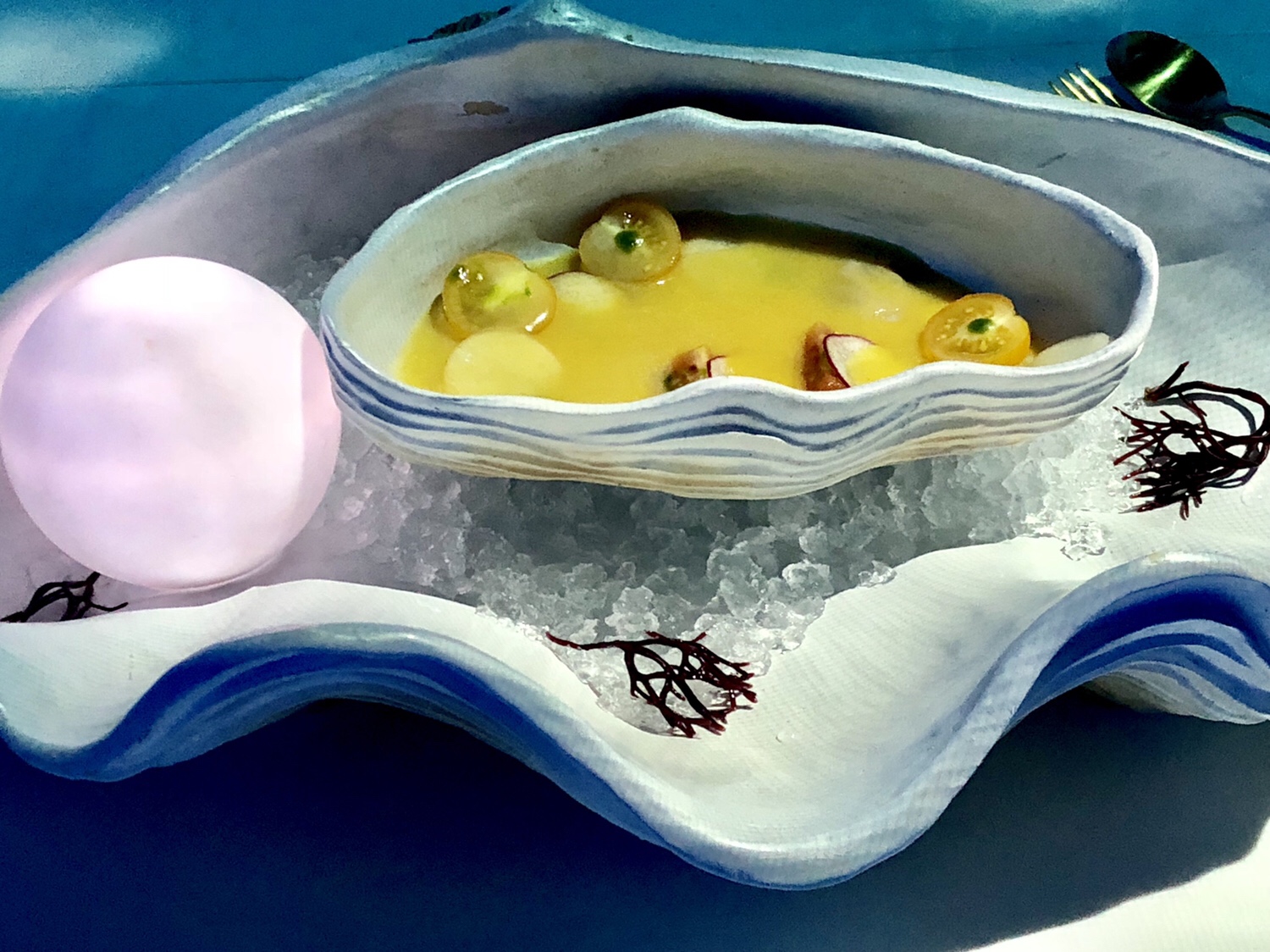 El fricasé de mariscos es un ravioli abierto en el que destaca el erizo, un excesivo perfume de hinojo y algas y otra gran y apropiada salsa marinera con toques frescos de yuzu.
