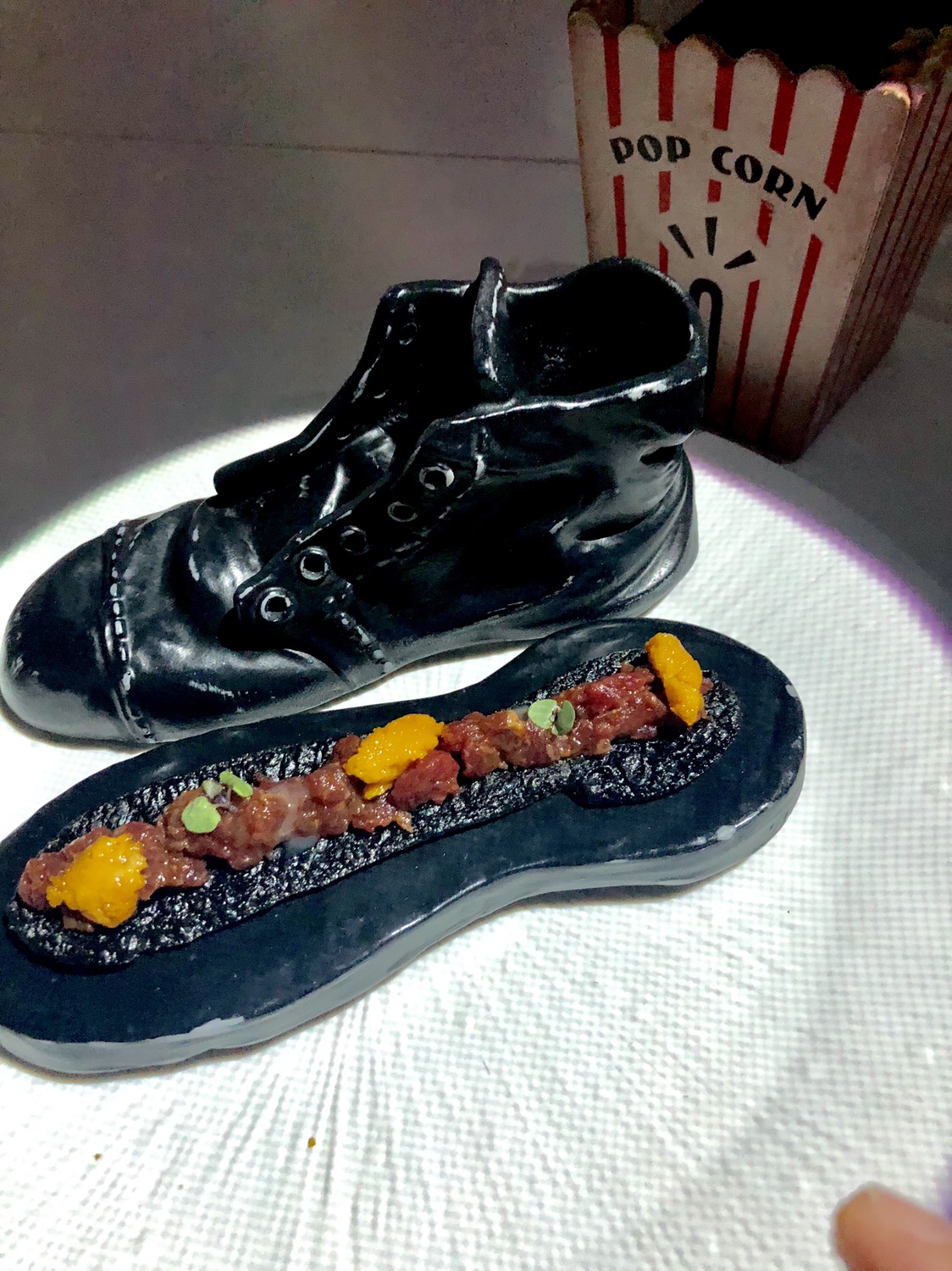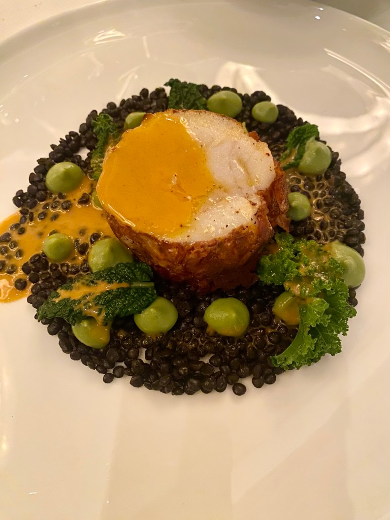 Impresionante, clásico y elegante el mero relleno de carabineros envuelto en chorizo y sobre un base de lentejas caviar, repollo “enmantequillado” y salsa Mallorca.