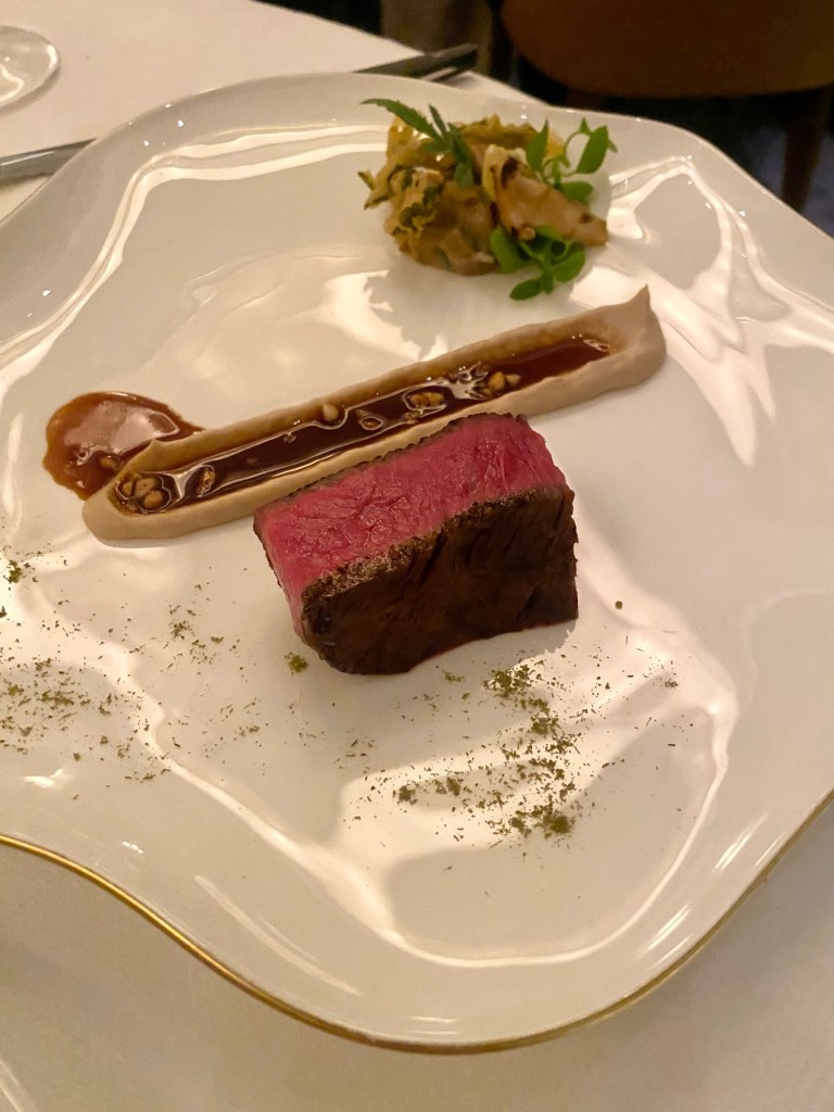Las carnes mantienen el altísimo nivel con un solomillo al carbón de calidad y punto espectaculares, con setas Matautake y una salsa Confiere, que no conocía pero que es de carne y acompaña a la perfección.