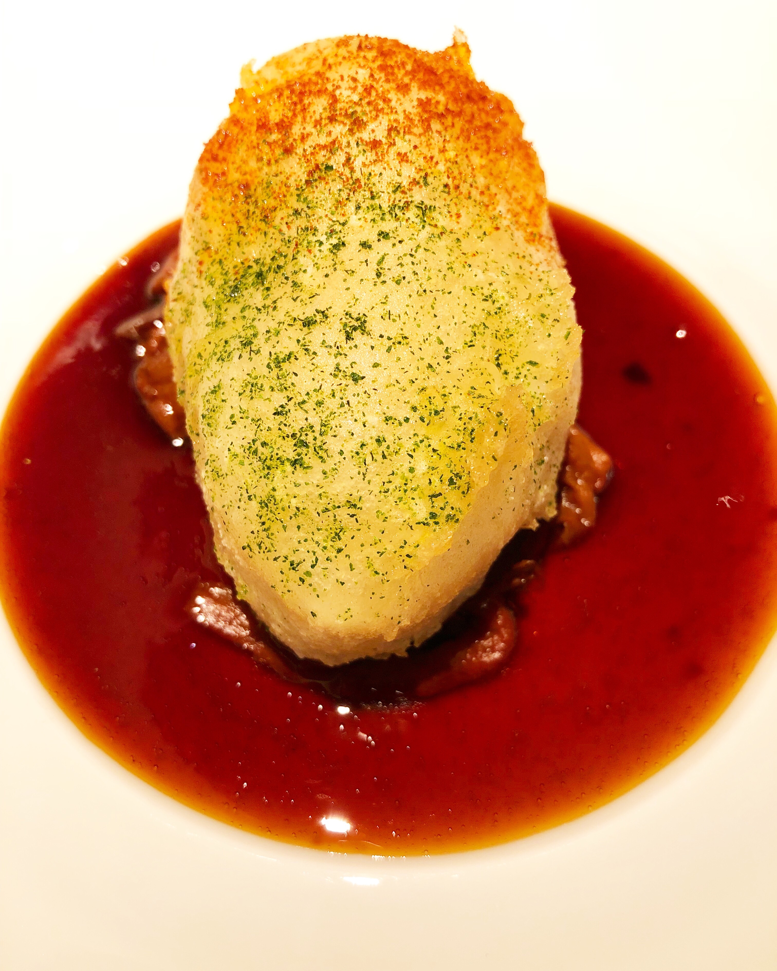 Pero a veces hay que desdecirse, a veces gana la gula y cómo rechazar el ofrecimiento de otro plato nuevo y servido por el mismo chef. Así que… «resignación»: Menos mal porque el katsu sandu de ventresca de atún rojo crujiente, brioche de mantequilla tostado, salsa barbacoa japonesa, botarga y trufa blanca es una de las cumbres de la comida. Por su gracia (a caballo entre sándwich y hamburguesa), su calidad (una ventresca perfecta que parece carne y una sublime y generosa trufa) y por sus guiños a muchas cocinas, sin olvidar la broma clasicista de unas patatas suflê memorables.