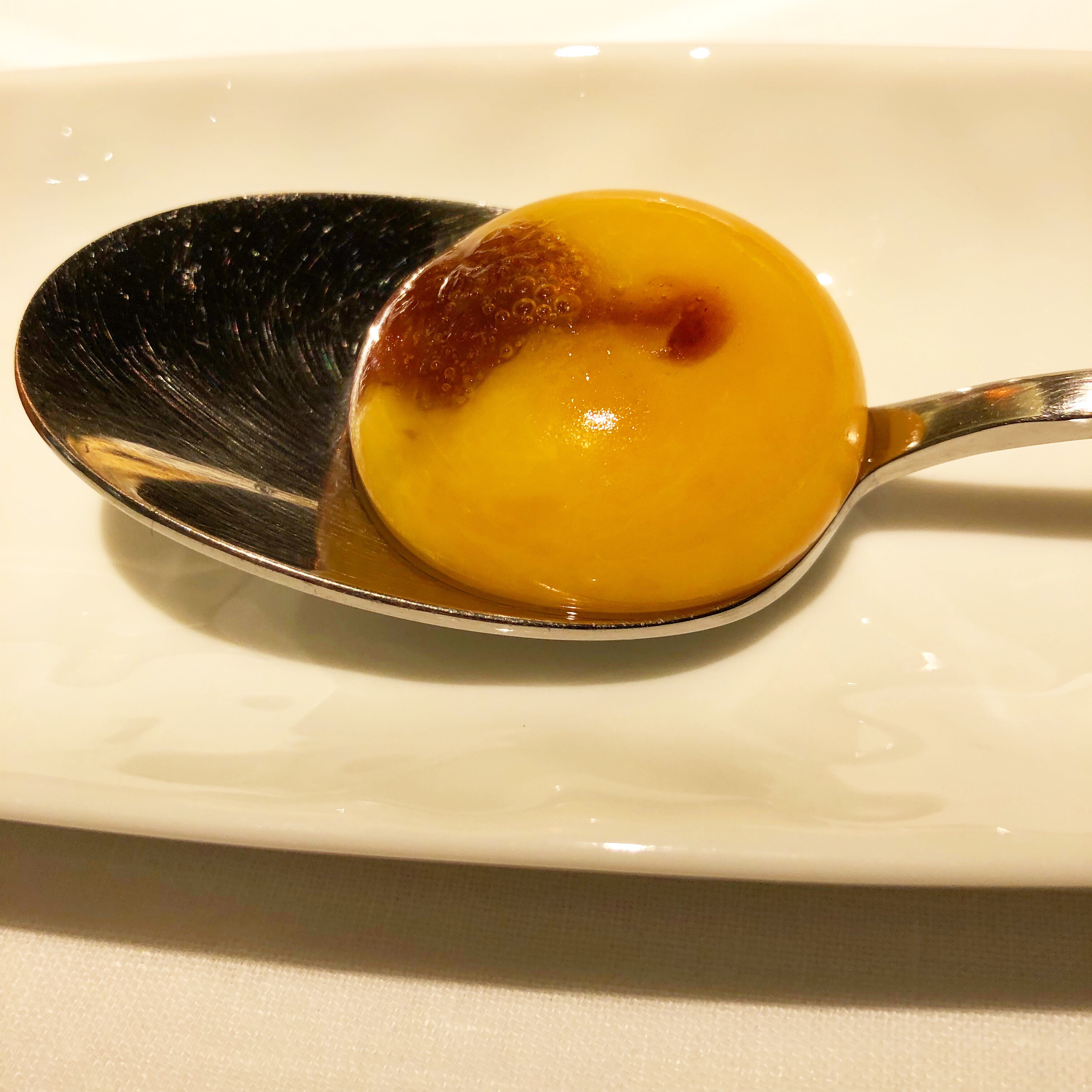 Los artífices de Clos son discípulos del elegante y fascinante Eneko Atxa y ello se nota desde el primer aperitivo, la famosa yema trufada de aquel, que aquí se rellena no con caldo de trufa sino con salsa de callos. Y para acompañar un crujiente picatoste que no llega a pan suflado.