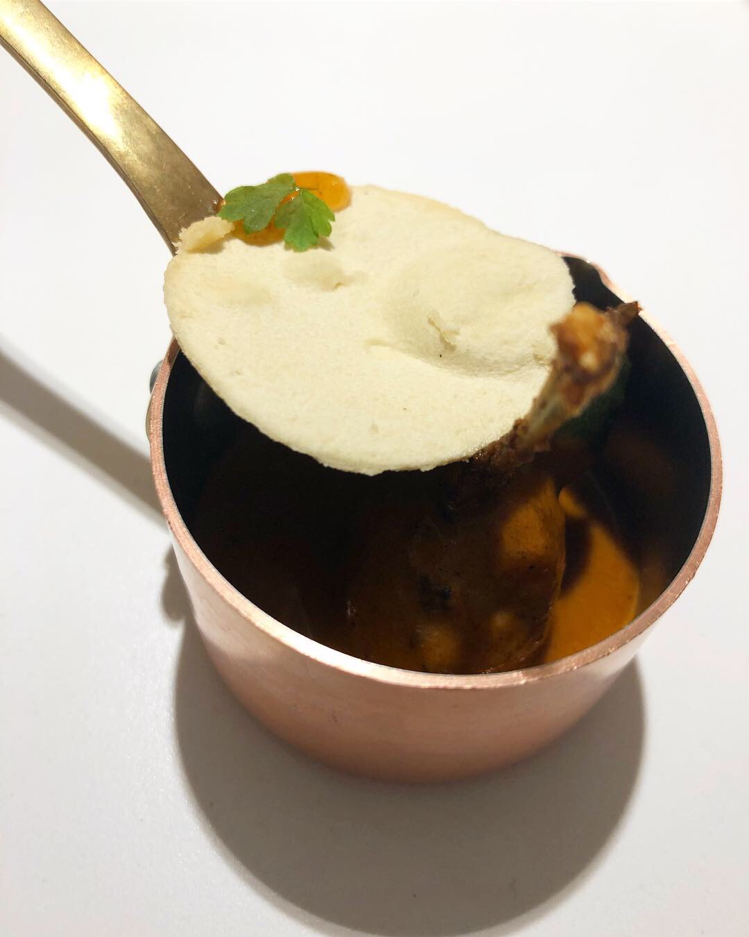 Comienza con un bocado de aguacate asado, cubierto de piel de leche y con salsa de menta, esferas de azafrán y yogur griego. La leve piel oculta un aguacate más suave y sabroso (por los ahumados del asado) y el contrataste de leche/yogur, fruta y especia (azafrán) es perfecto.