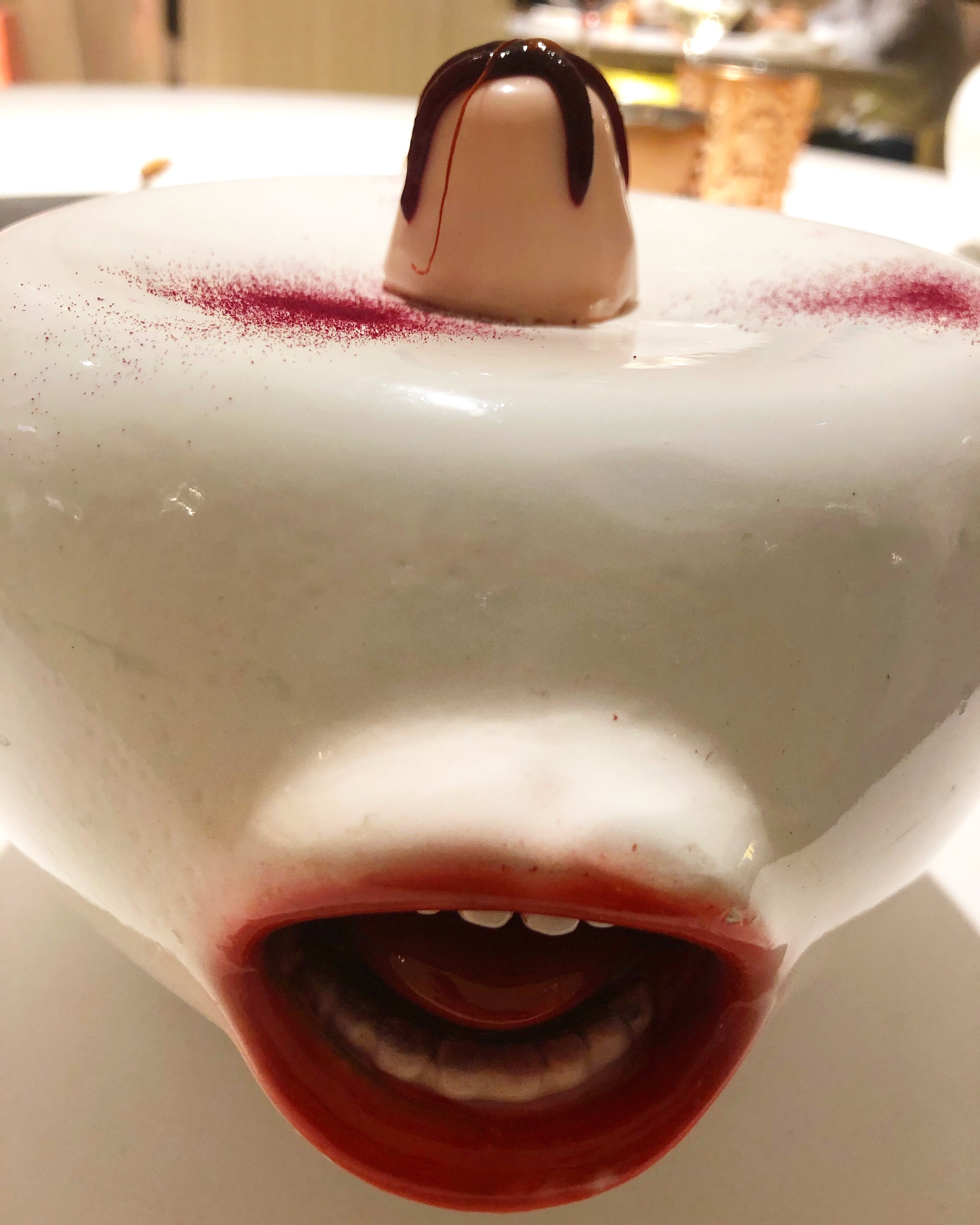 Sorbiendo tu infancia… Flan de algodón de feria, remolacha, vainilla y toque de salsa siracha es el último juego y se recibe con alegría. Es un pequeño flan que hay que sorber. Parece que es frecuente en los niños. Yo jamás lo hice, así que ha sido una nueva experiencia y me ha gustado. No se asusten tampoco. ¡Es muy pequeño! Y el toque picante, muy leve.