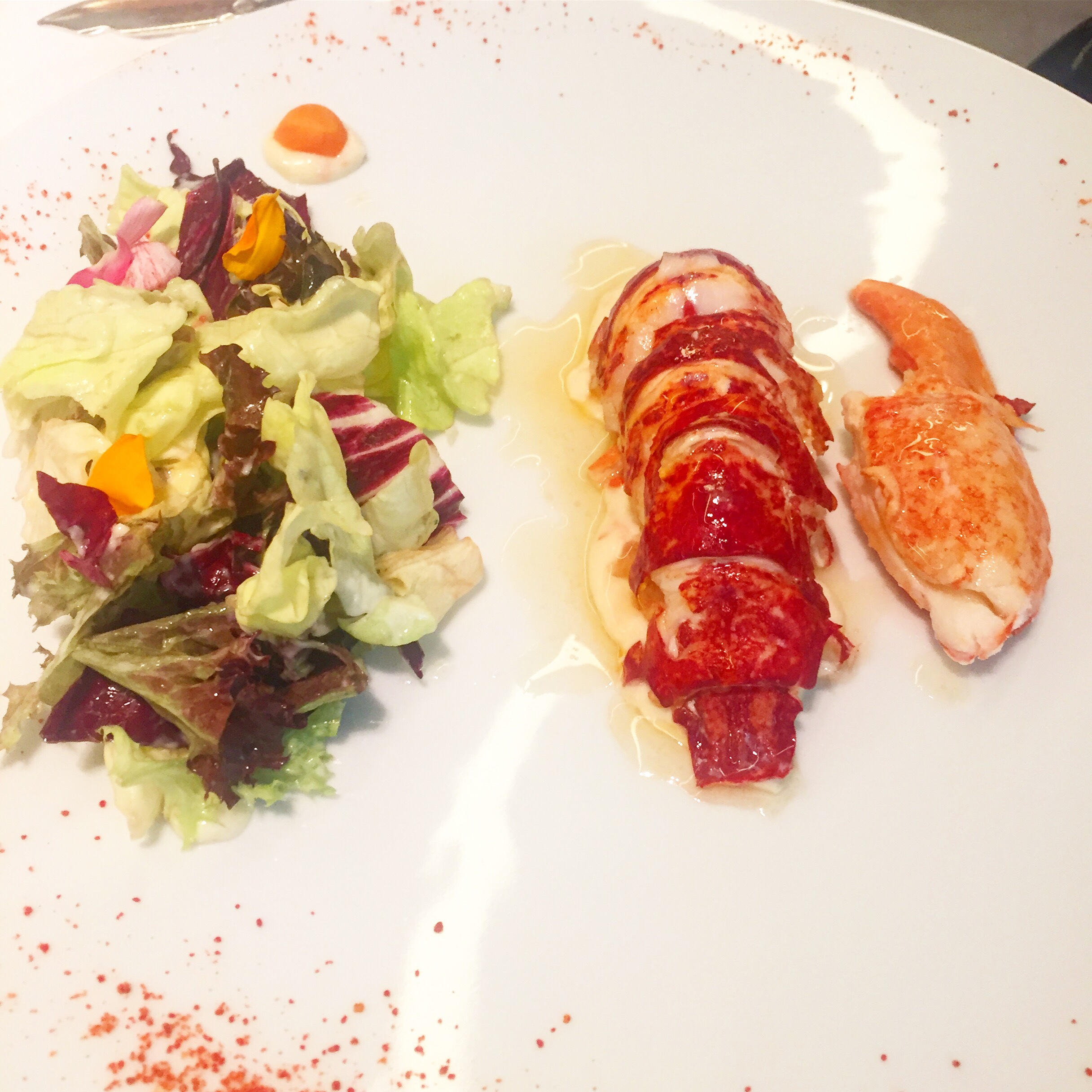 También es un clásico la ensalada de bogavante que resalta por la calidad del crustáceo que es, y así lo señalan, gallego. Basta ver en cualquier mercado la diferencia de precio entre este y el de otros mares para saber de qué hablo. Las lechugas que acompañan ganarían con un poco más de imaginación, pero lo que importa desde luego es el aristocrático marisco.