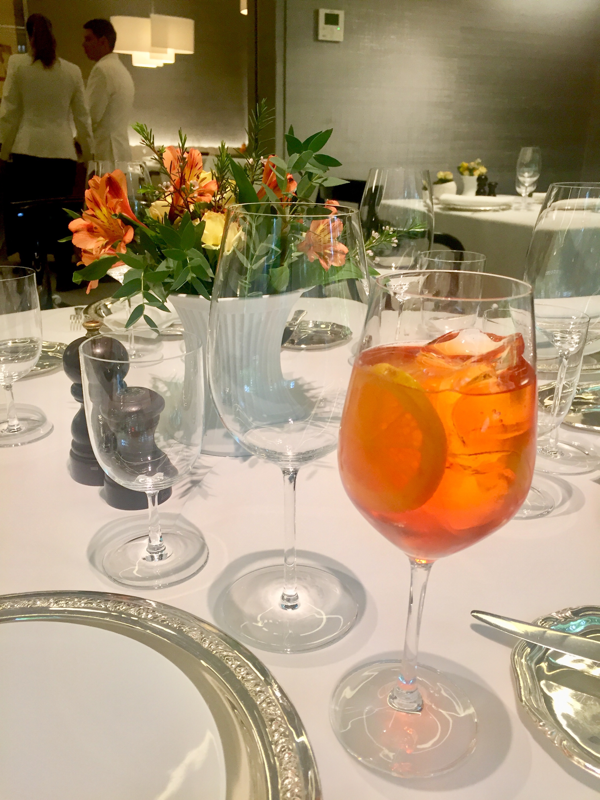La carta de vinos es impresionante en calidad y cantidad, pero vale la pena probar los estupendos cócteles, esta vez un aromático e intenso Negroni acompañado de unas ricas patatas suflé.