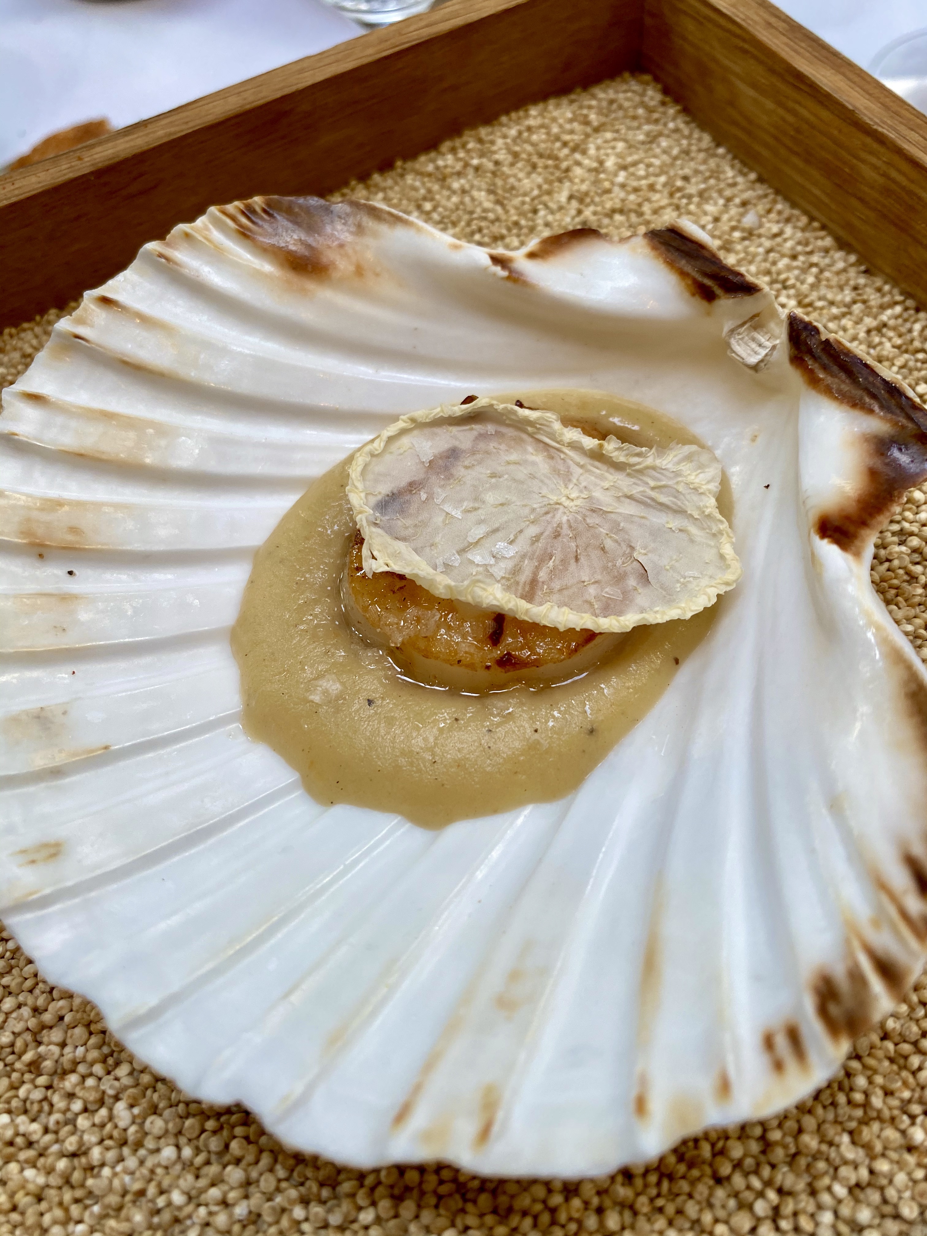 Junto a lo chino, un homenaje hispanoamericano (del norte) a la sopa más famosa de los USA: clam Chowder a la mantequilla de búfala y Riesling, almejas de la Ría envueltas en papada ibérica, tapioca a las finas hierbas y sésamo negro. La papada envolviendo la almeja consigue darle un toque terrestre y salado excelente, la tapioca se esferifica con queso y vino y para acompañar se sirve el único «pan» de la comida: un bizcocho aireado de sésamo negro. ¡Mucho mejor que el original americano!