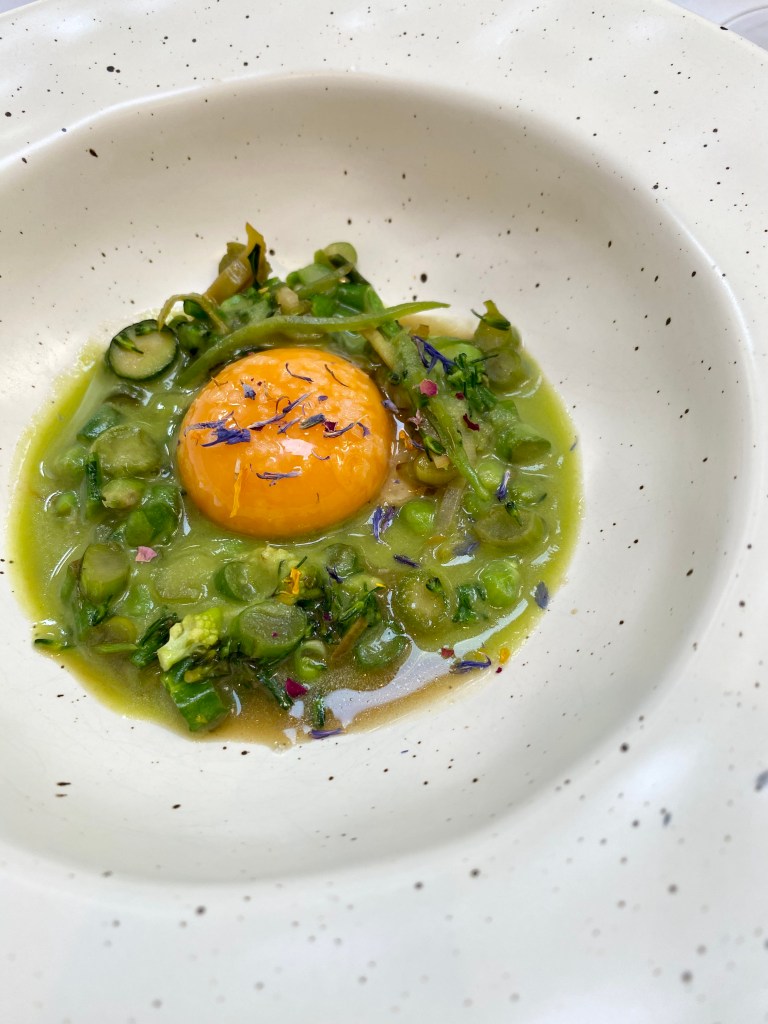 También muy sencilla es la menestra con yema de huevo (yo no la pondría porque añade demasiada viscosidad, pero es cuestión de gustos) y un poco de menta que le da un sabor fresco y campestre. Las verduras al dente y ymuy sabrosas.