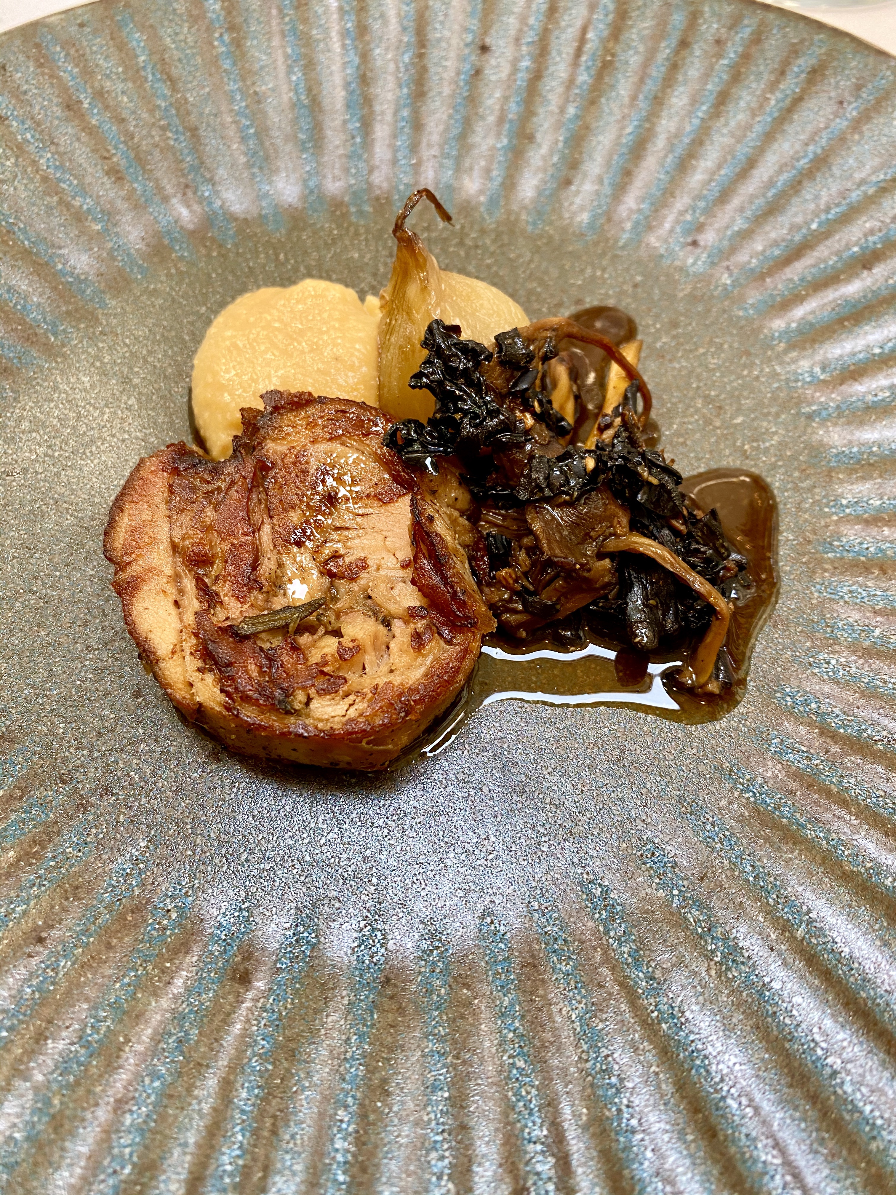 La porcetta es un gran plato italiano no muy conocido en España. Se trata de un rollo de carne de cerdo sazonada con muchas hierbas y después asada, perdiendo en el asado casi toda la grasa. Esta estaba deliciosa gracias a la densa salsa y a un dulce puré de membrillo. Para rematar, setas salteadas y nada más porque nada más necesita.