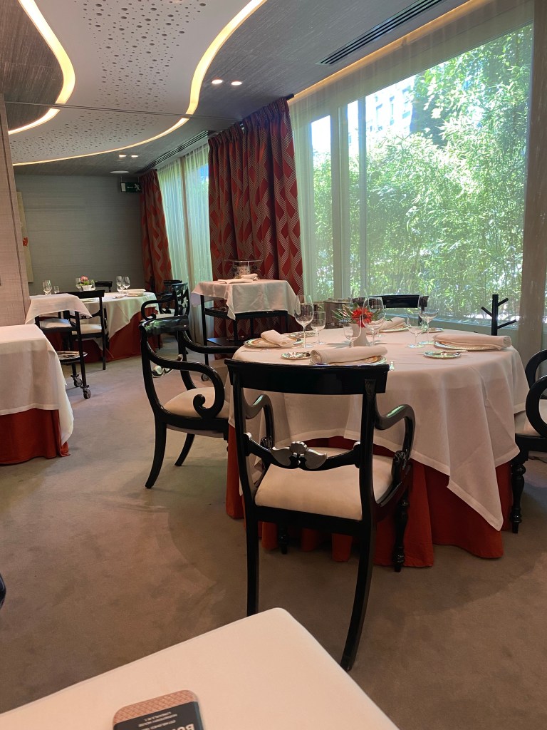 Estupendo almuerzo en Saddle, uno de los restaurantes más elegantes de Madrid y, entre los clásicos, uno de los más sobresalientes. En cada visita noto un mejoría y en esta, hay que resaltar el cuidadoso y eficaz trabajo del chef Adolfo Santos, que borda platos de la alta cocina de siempre y crea otros nuevos, impregnados de refinamiento y clasicismo. También me gusta el servicio perfecto que no cae en el amaneramiento y evita el anterior y exagerado baile de carritos.