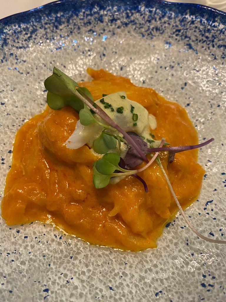 Mucho más interesante es el centollo con calabaza, una mezcla sutil. La opulenta carne del crustáceo siempre está deliciosa pero el caldo de calabaza le pone, como al erizo, un contraste dulce que la intensifica. Y para quien quiere más sabor, unos puntitos de punzante mayonesa así lo hacen.