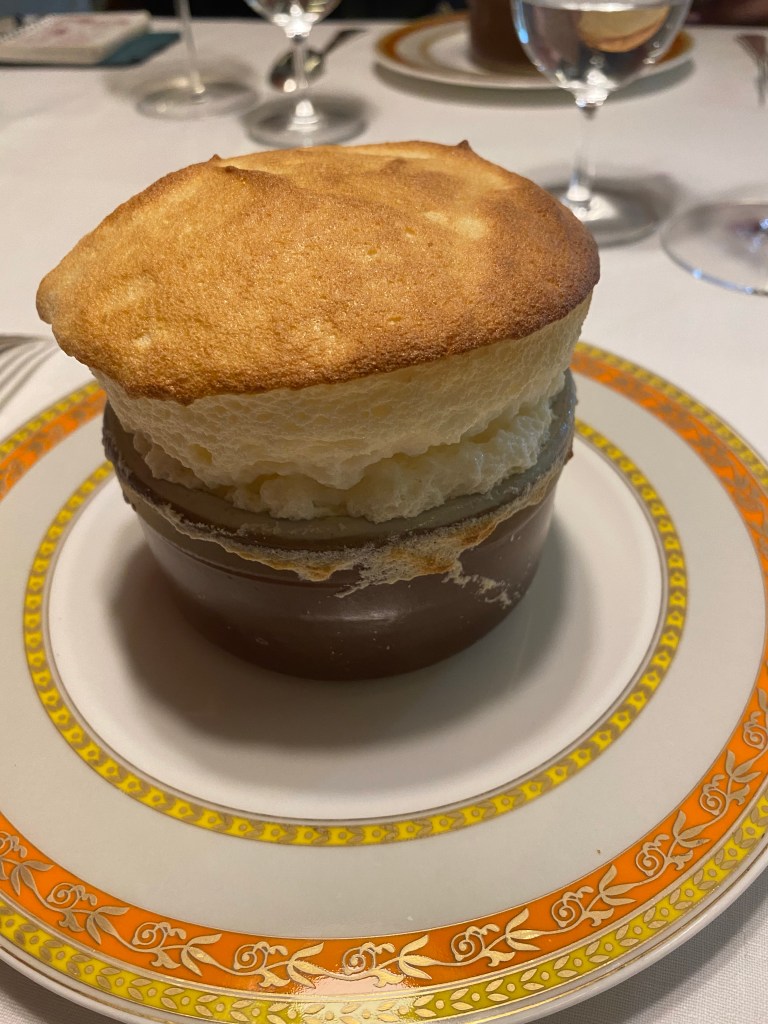 Habrán visto, una vez llegados aquí, que el balance no está nada mal pero quizá lo mejor estaba por llegar porque el suflé es espléndido, mullido, no demasiado azucarado y con el Grand Marnier flambeado. La mayor parte de las veces lo ponen en crema o aromatizando pero flambearlo y servirlo en llamas es espectacular y mucho más sabroso. Si la memoria no me falla, el mejor suflé que he comido recientemente en España.