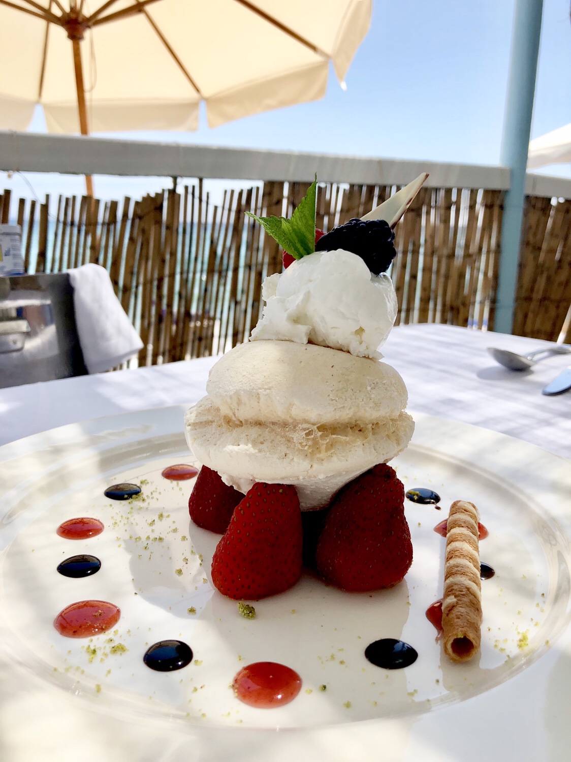 Todo iba bastante bien hasta el postre que tardó una media hora en un restaurante que estaba semivacío. Quizá fuera casualidad, pero ni quiero pensar en el ritmo con la casa llena… Los postres revelaban una cierta propensión a la repostería clásica (mousse de chocolate belga, tarte citron, ganache de chocolate blanco) así que me dejé llevar y opté por un clásico entre los clásicos, la Pavlova y hay que reconocer que tras el traspié del pescado y la espera, el resultado fue excelente: un merengue crujiente y esponjoso por dentro acompañado de unas frutas rojas deliciosas perfectamente maceradas.