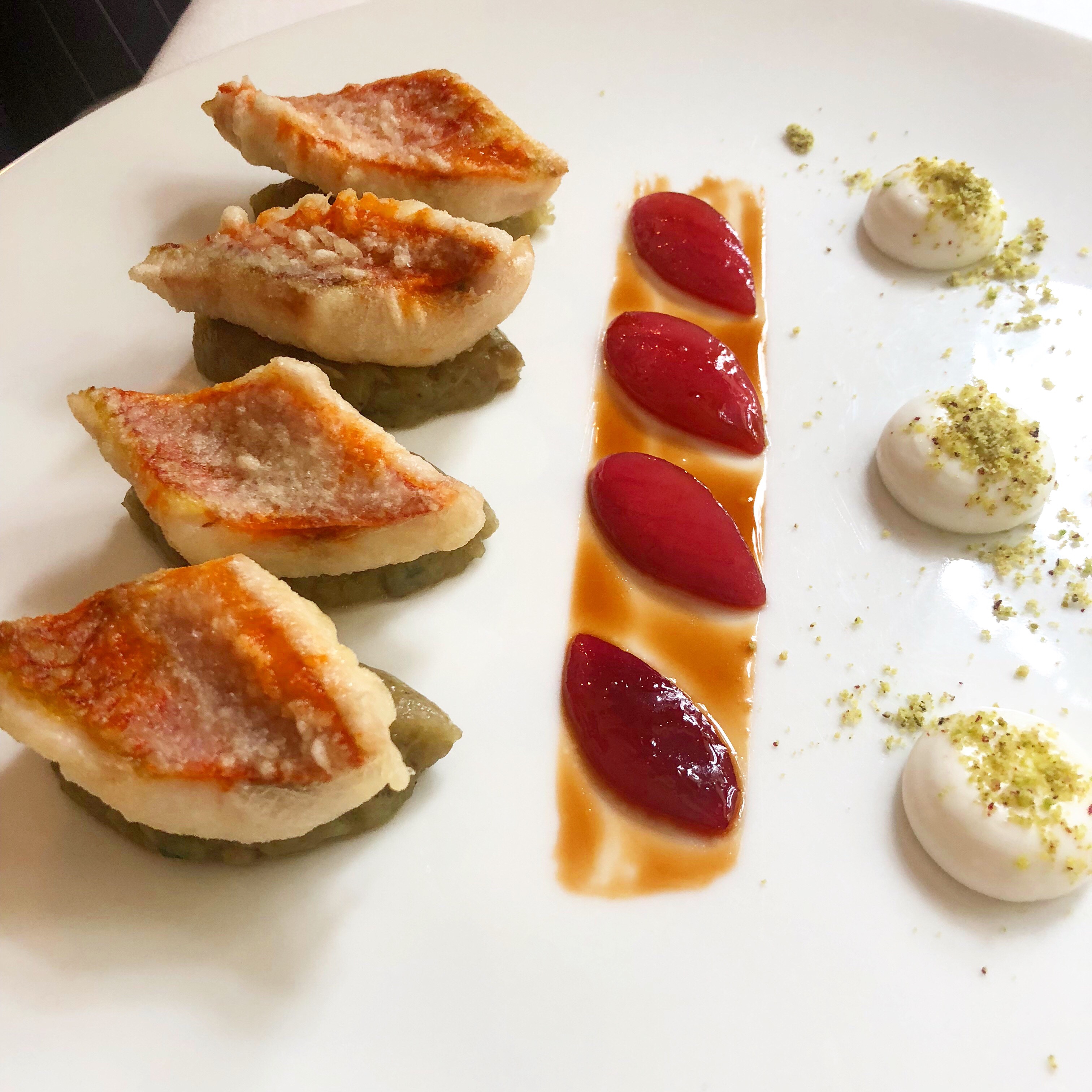 Con este almuerzo, atreverse con una carne habría sido semisuicida, así que nada mejor que unos suculentos salmonetes fritos (el frito es tan de Roma como de Cádiz, me temo; aquí les gusta todo frito). Los sirven crujientes y salinos sobre puré de berenjena y un toque chispeante de cebolla marinada en vinagre y unas gotas de crema de provola con pistachos menos comprensible pero muy buena.
