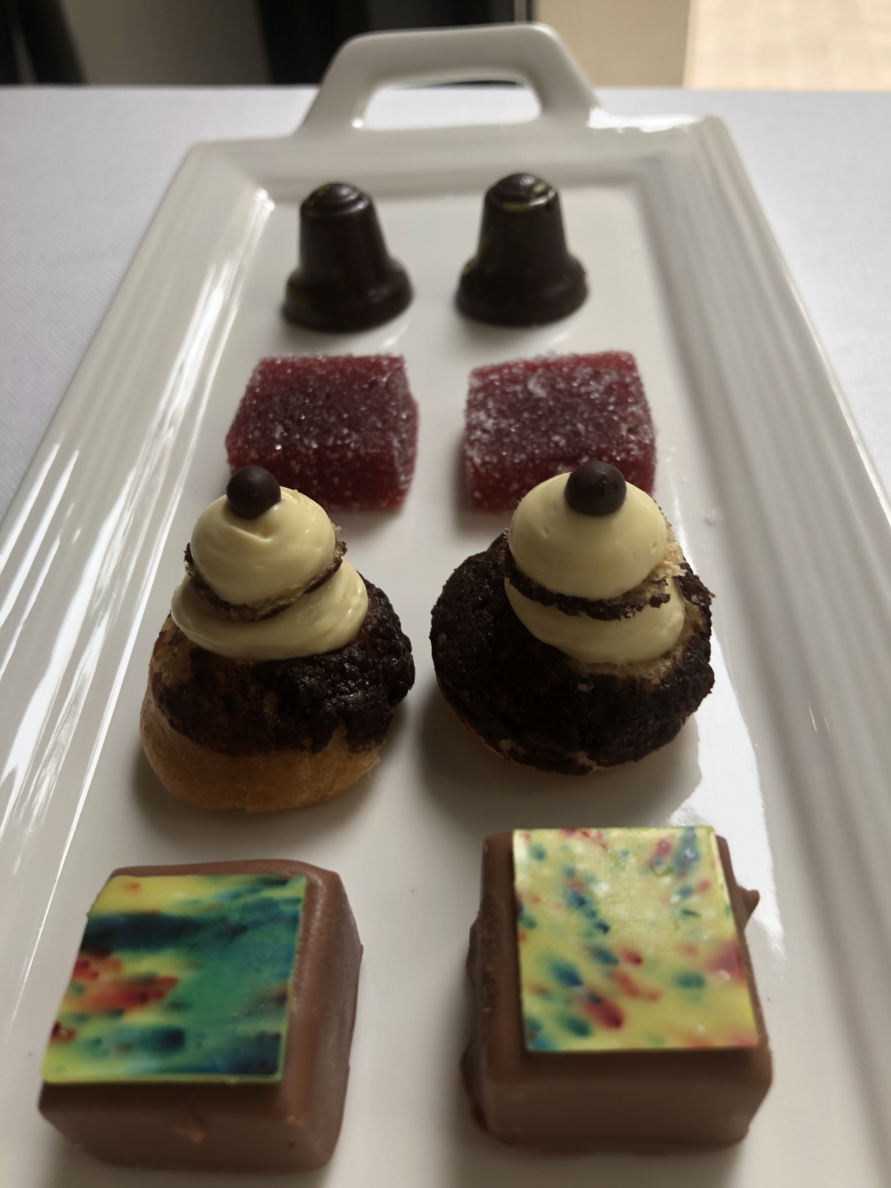 Menos mal que las mignardises suben el nivel repostero con unas deliciosas tartaletas de frambuesas y fresitas, unas agradables cerezas al marrasquino, un buen hojaldre de crema y dos buenos bombones, de chocolate y avellanas y de chocolate y oro, con chocolate negro negro.