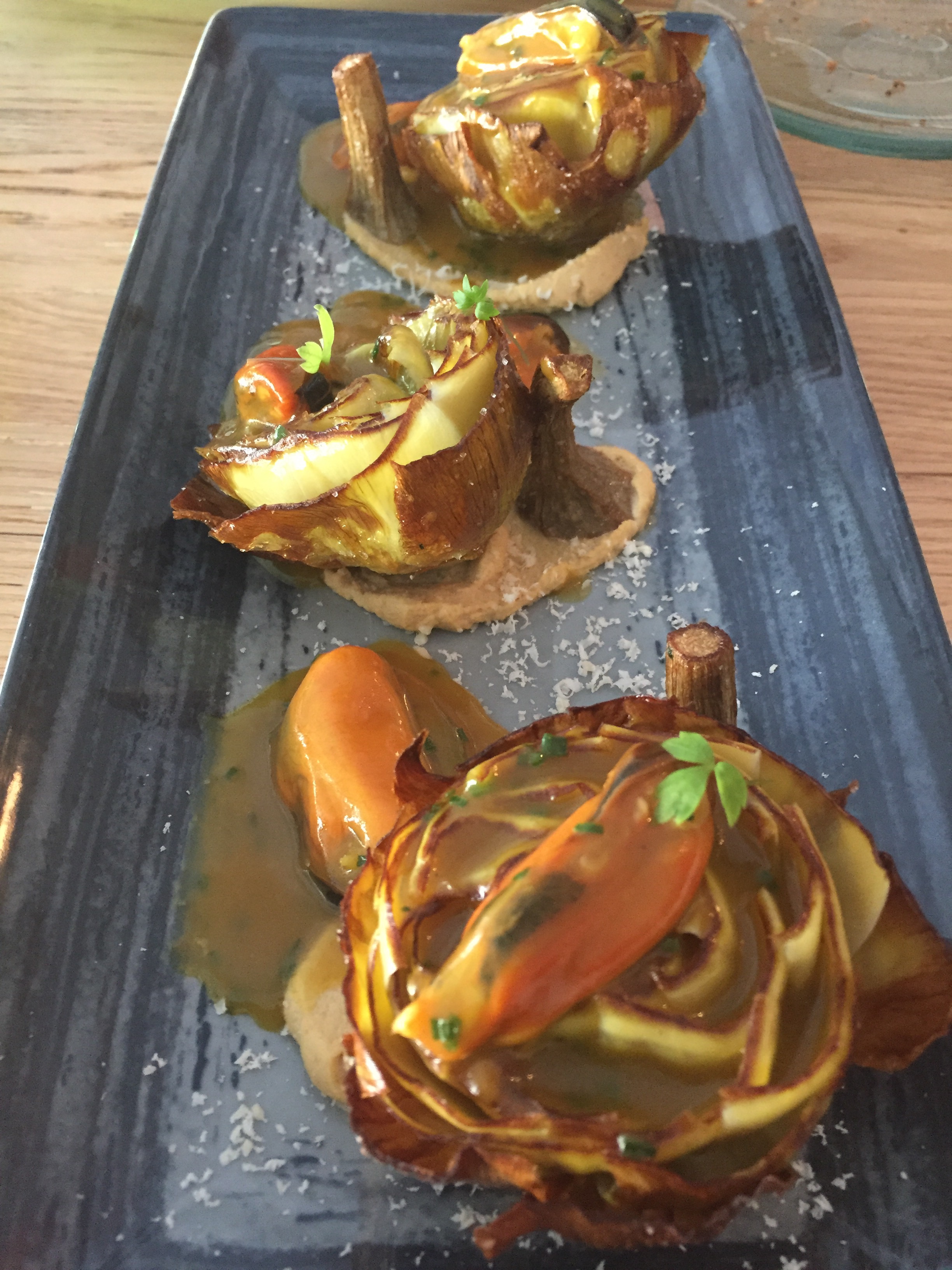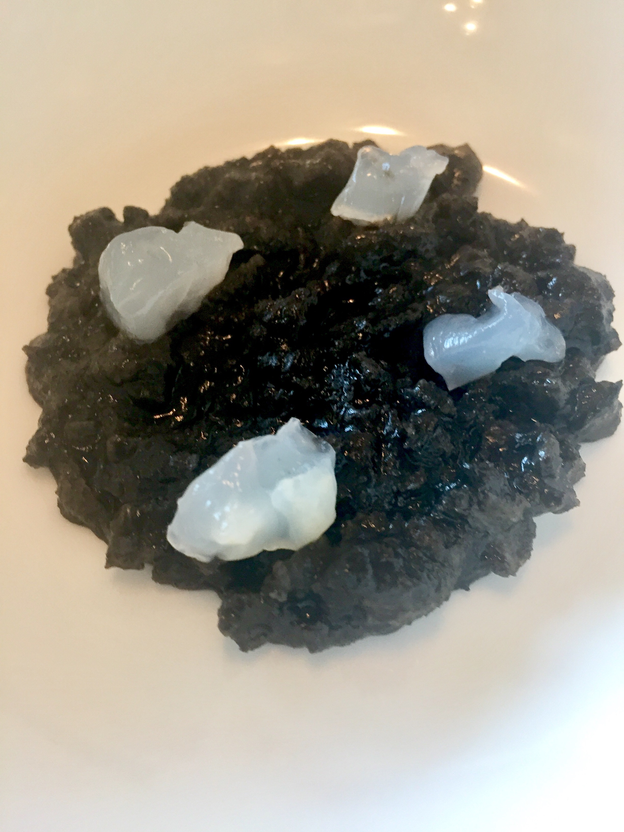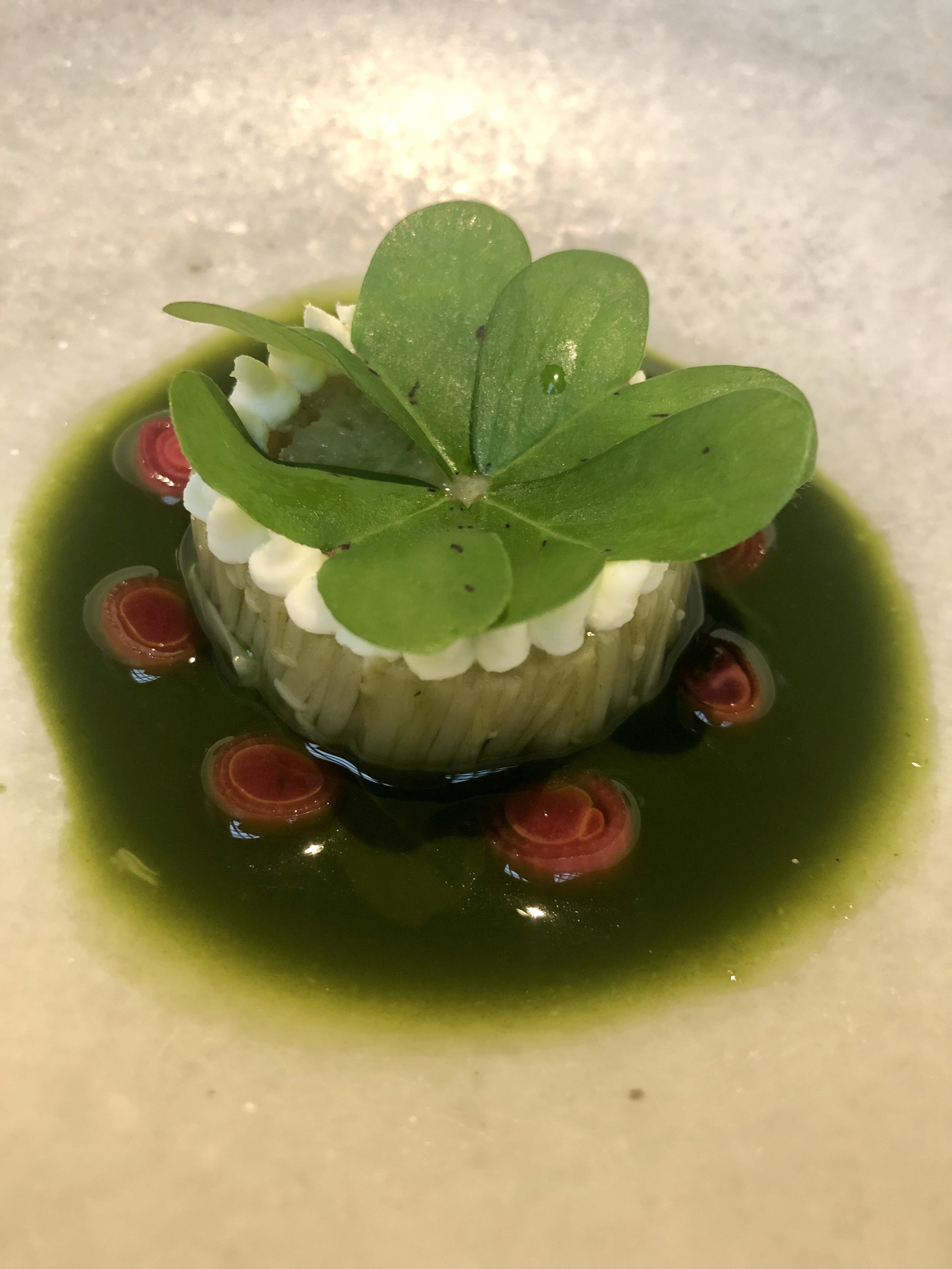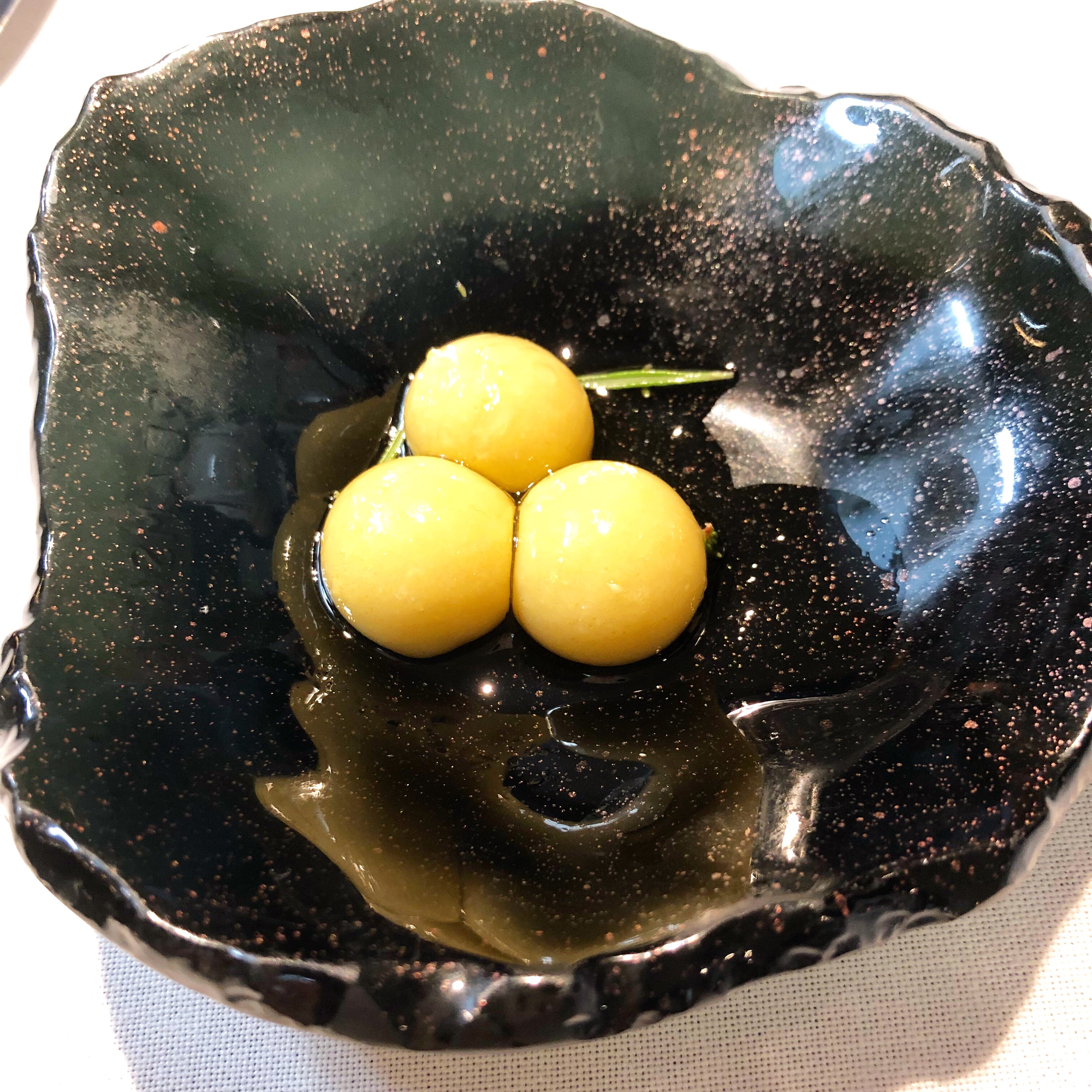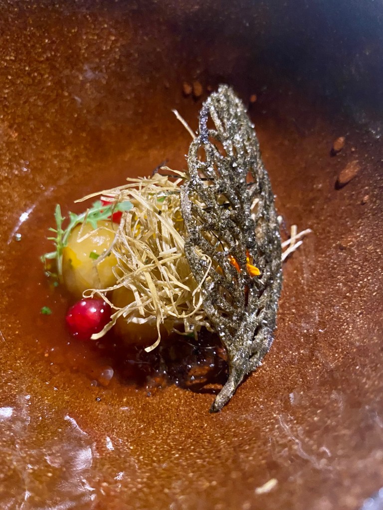 Y delicioso resulta el néctar de tomate a la brasa, tomates cherry de navazos, grosellas y alga nori. Los navazos son huertos que se forman ahondando el arenal de una marisma, lo que da a las hortalizas sabores marinos asombrosos. Los tomates marinados son una delicia. También usa tomate cereza amarillo, además de jugo tomate ahumado y una bonita y crujiente galleta de alga kombu.