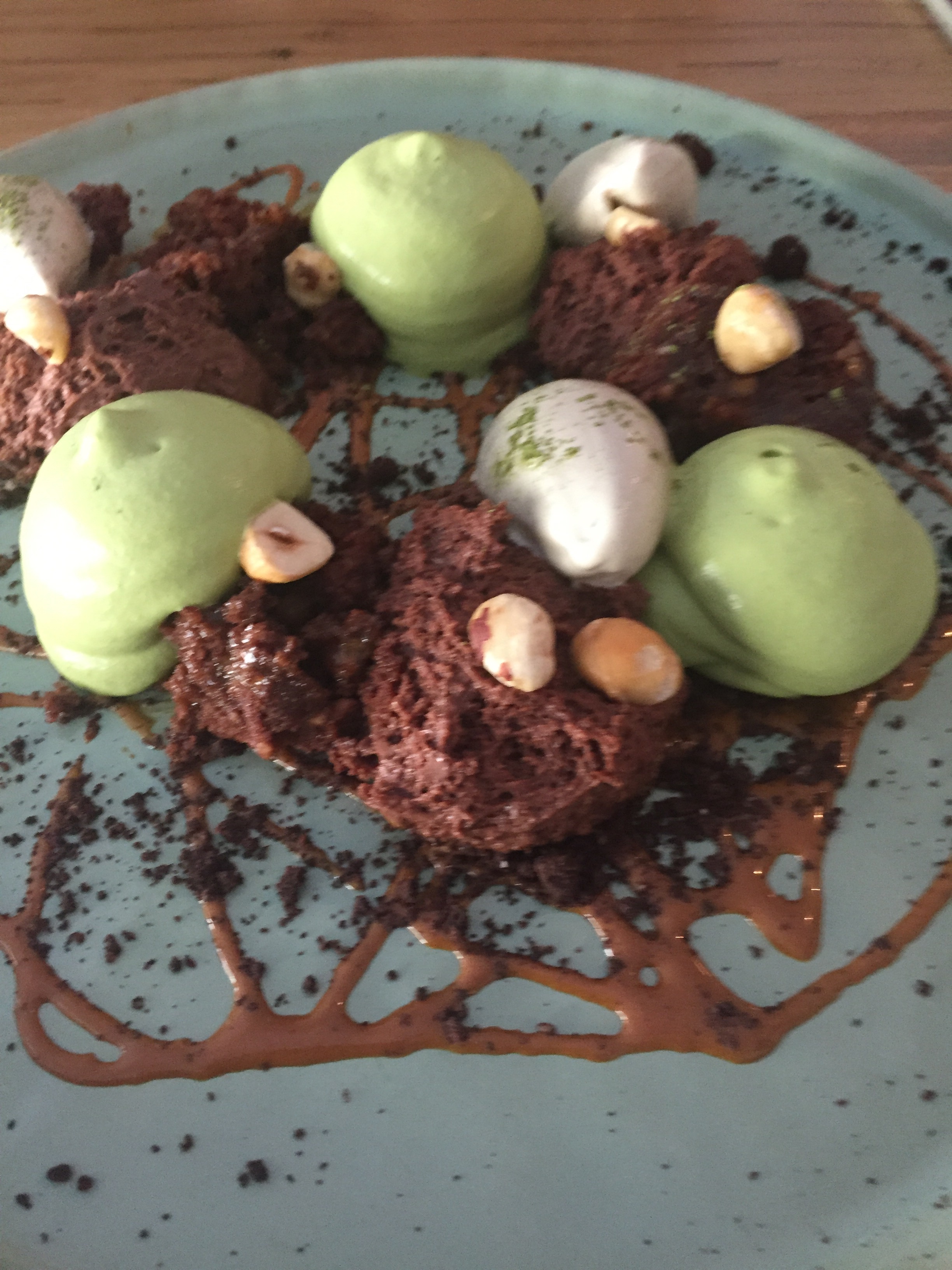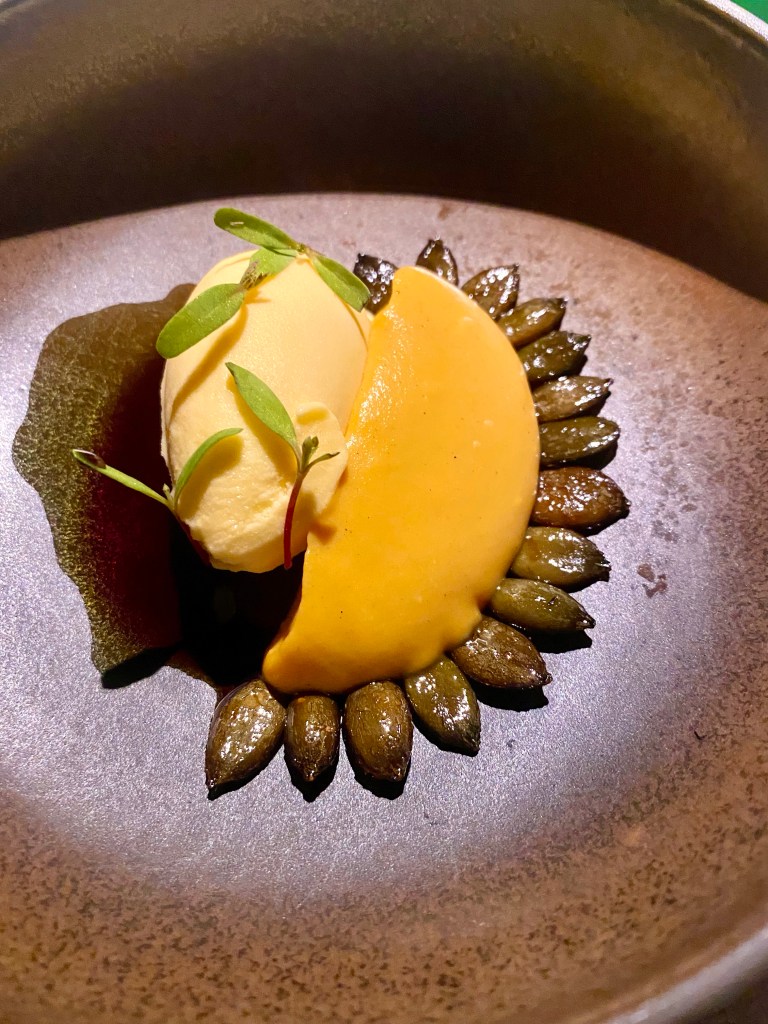 Muy original la calabaza a la brasa y mandarina, en esa línea tan moderna y española de postres que huyen tanto de lo dulce como lo de lo convencional. Los helados de calabaza y mandarina (gran mezcla) se completan con unas buenas pipas de calabaza garrapiñadas (en salado) y también aceite de calabaza. No sé si más original que bueno.