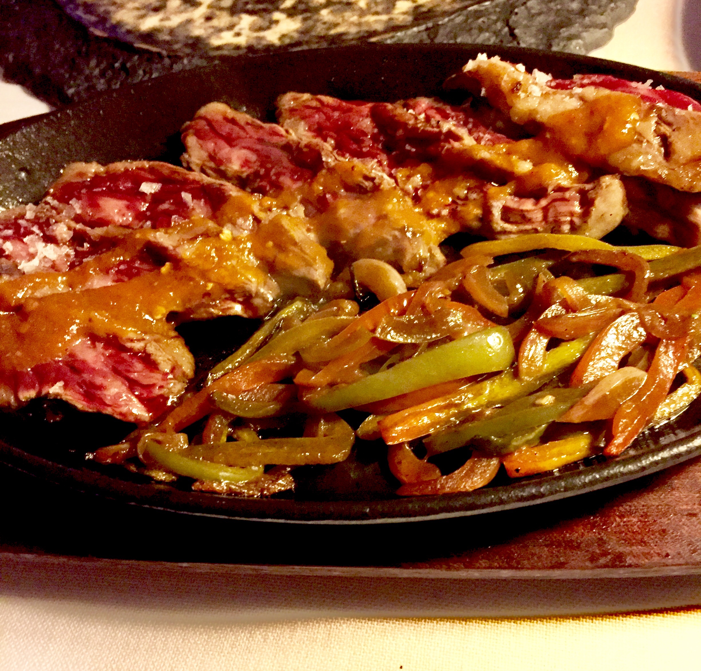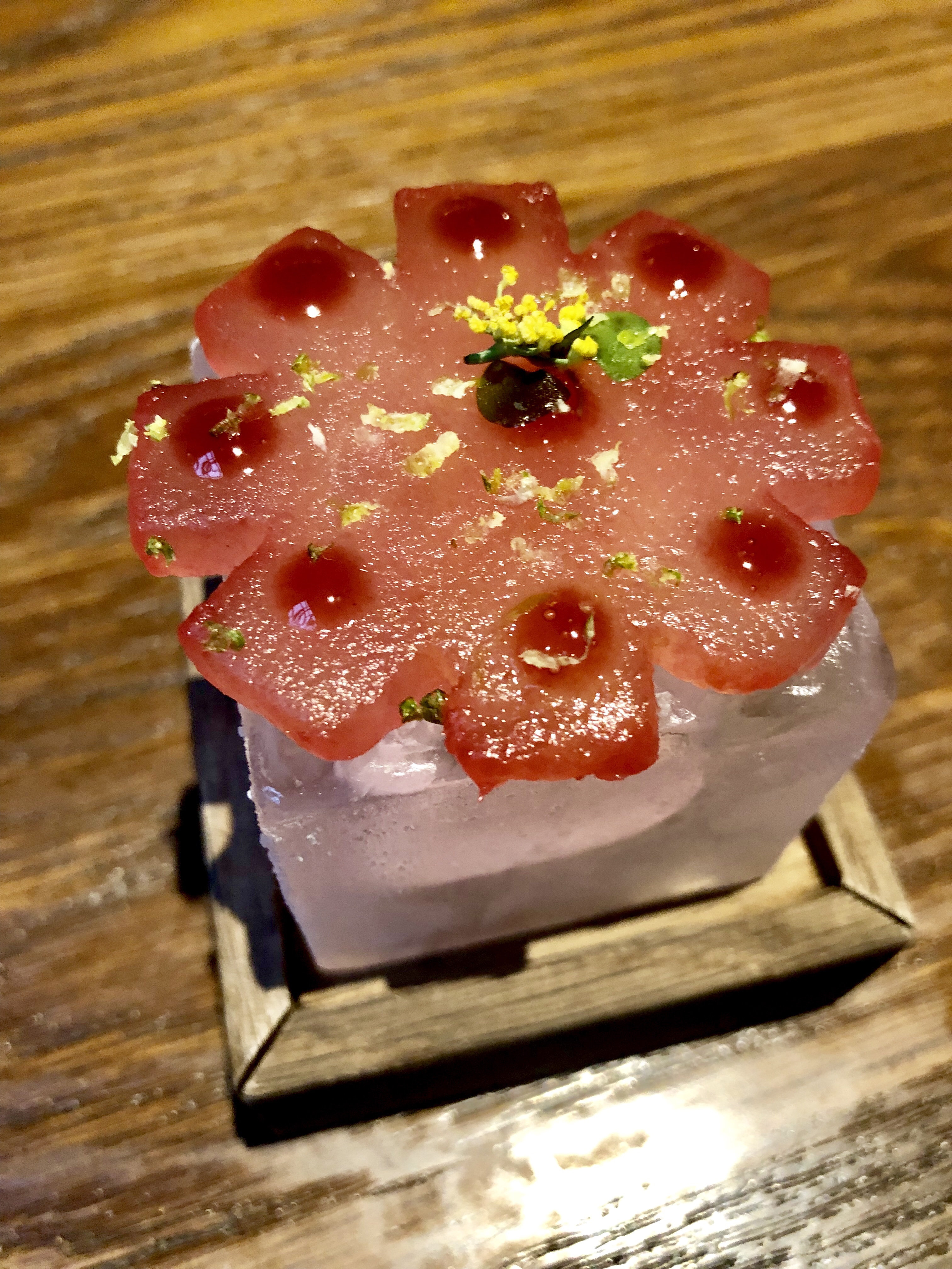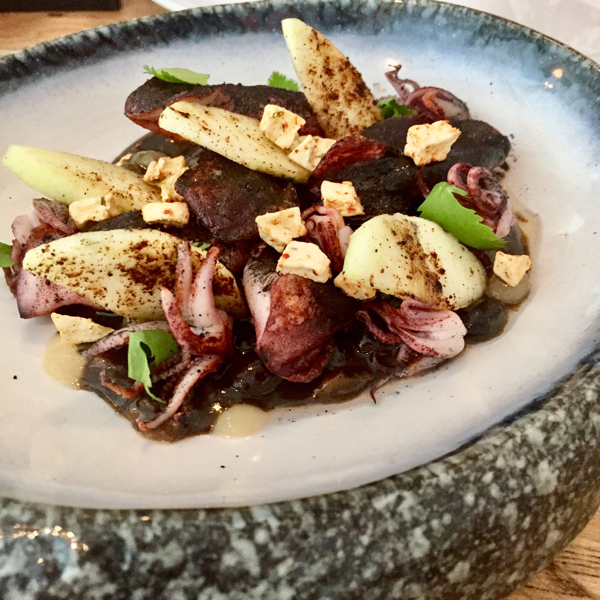 Morrillo de atún a la brasa con morcilla de Beasain parecería una declinación de los mismo, pero nada tiene que ver. Se prepara ante nuestros ojos y lleva una salsa con soja, que le aporta un fuerte y salado sabor, jengibre, miso de soja blanca y cómo no, un delicioso morrillo. Y para intensificar la naturaleza grasa y sanguínea del morrillo, lo más sanguíneo y graso de la tierra, la morcilla de sangre y cebolla. Parece carne pero no lo es aunque lo merece. Intenso, salado, potente, con una adictiva viscosidad como de almíbar.