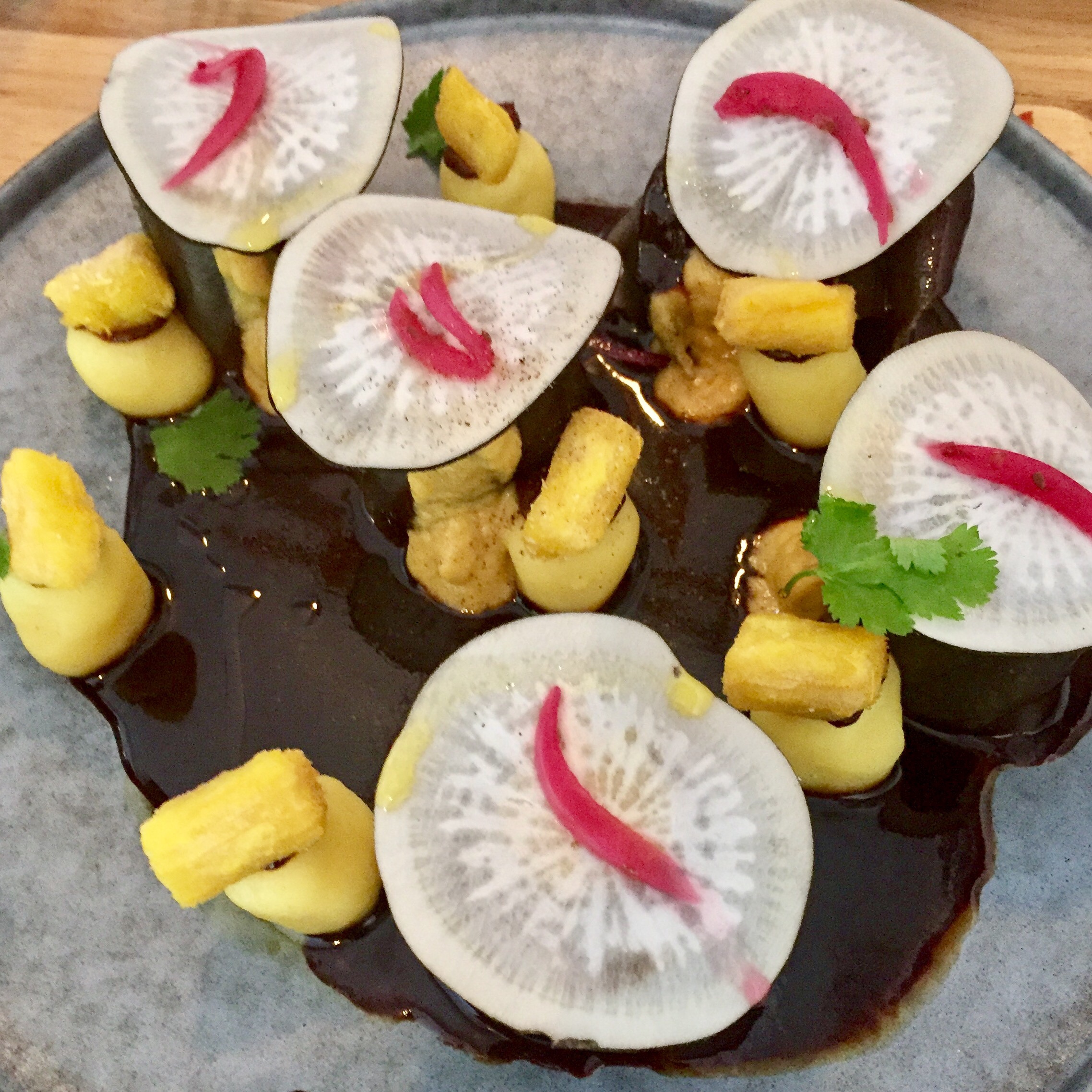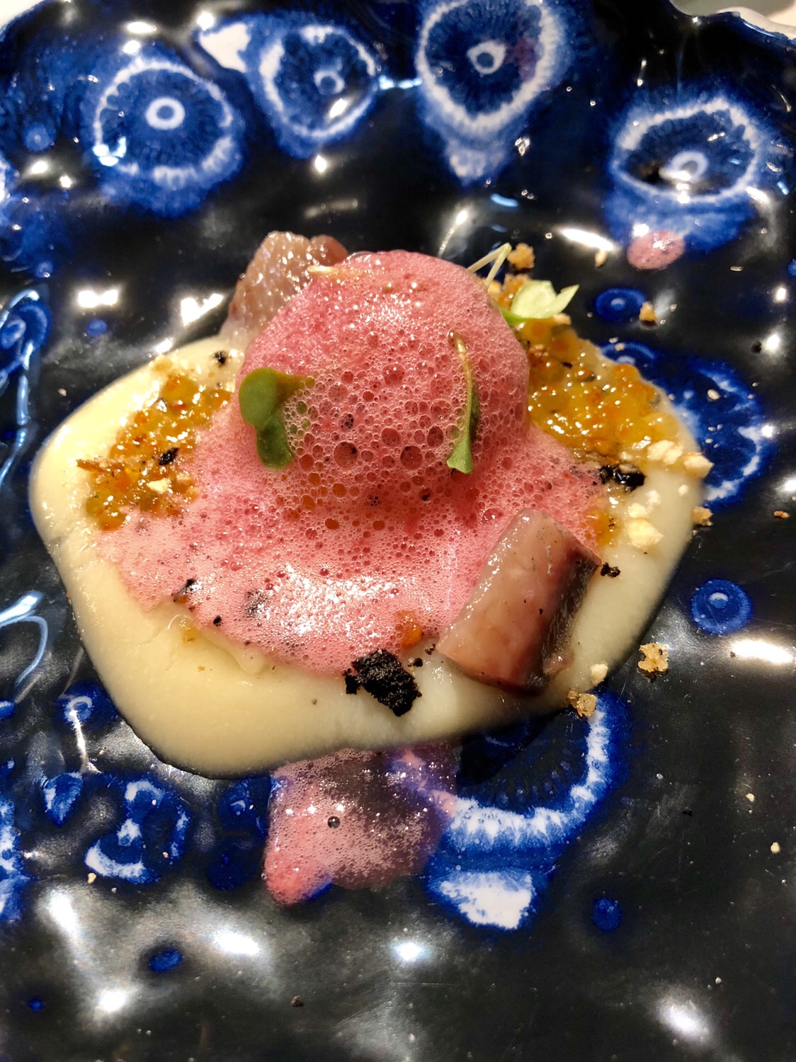El dashi de tomate, moluscos y puré de aguacate ahumado, también es una magnífica idea que recrea un ceviche con el añadido del dashi. Parece simple porque solo tiene un sabroso hielo picado acevichado, buenas concha fina y berberecho y un delicado fondo de aguacate ahumado, pero conceptualmente es muy interesante. Recuerda mucho al ceviche pero las texturas son diferentes y el sabor más complejo.