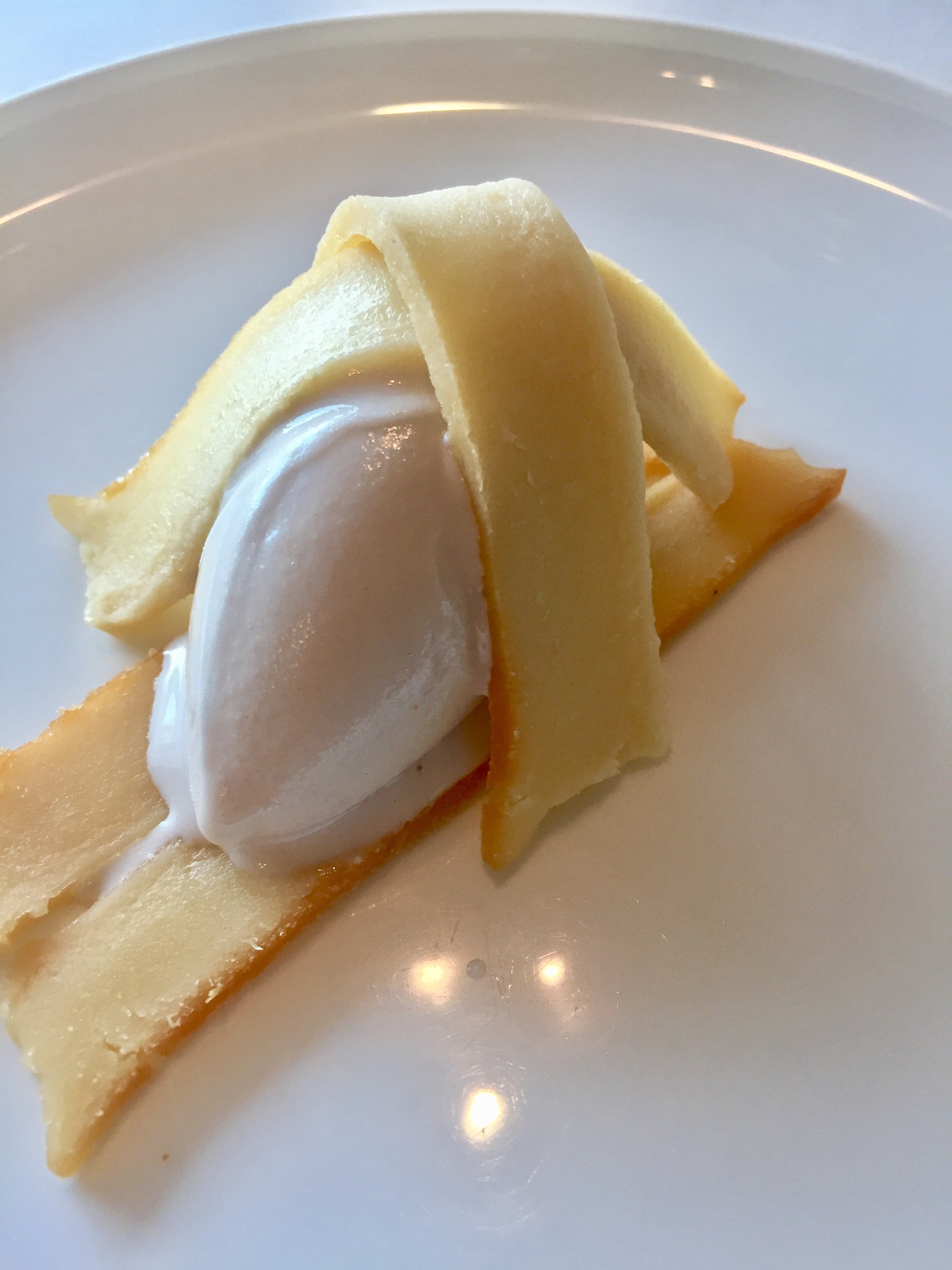 Quizá sea porque aguanta mejor la maduración o por estar menos hecho, pero el virrey reposado, guisantes lagrima a la brasa y sabayon de miso y Palo Cortado, está buenísimo y es un excelente plato de pescado. Madurado de 7 a 12 días, tiene gran sabor y textura pero es que además el acompañamiento de guisantes làgrima a la brasa y el suave sabayon son espléndidos.