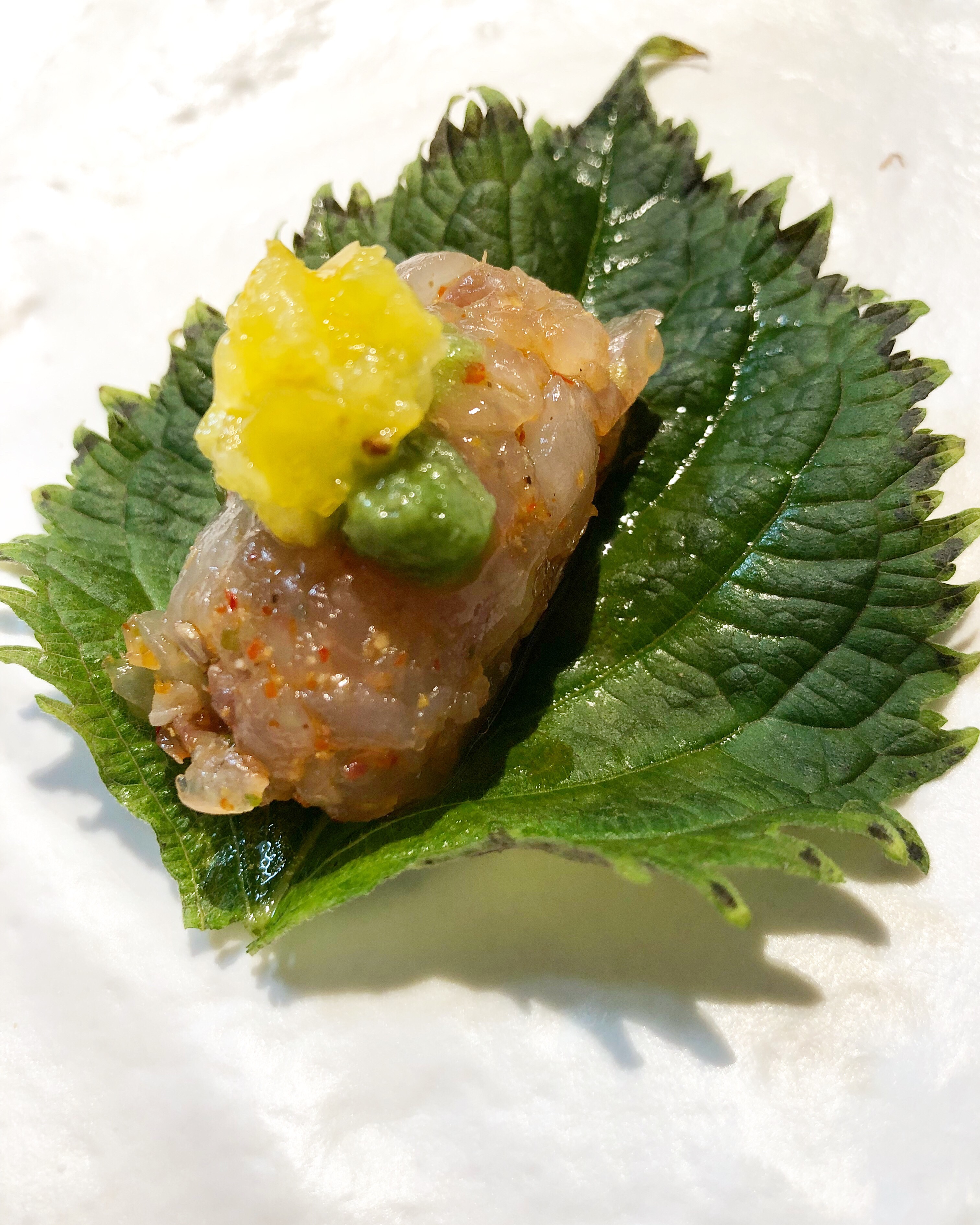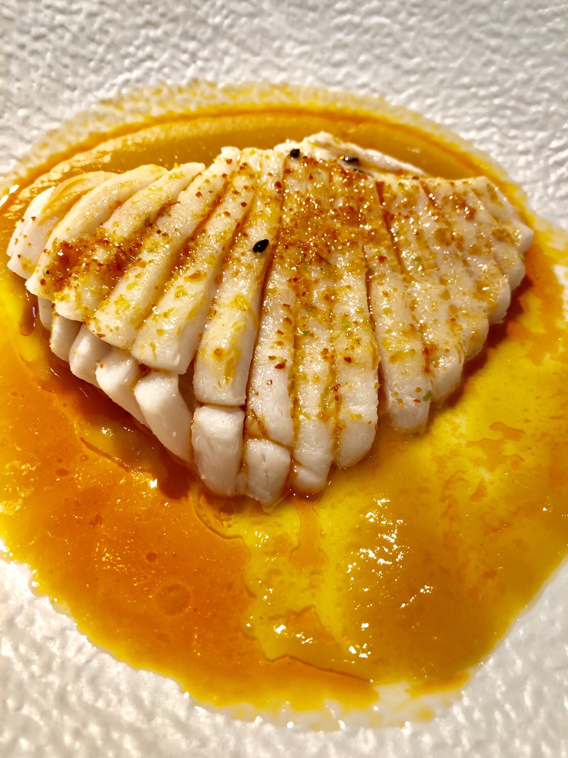 La quisquilla de Motril, mantequilla noisette y pimienta ahumada, tiene también yuzu kosho -lo que le da un toque cítrico- y está bastante buena gracias a un toque picante que me encanta. Sin embargo, la base de mantequilla derretida, a mi particularmente, me resulta demasiado grasa y empalagosa.
