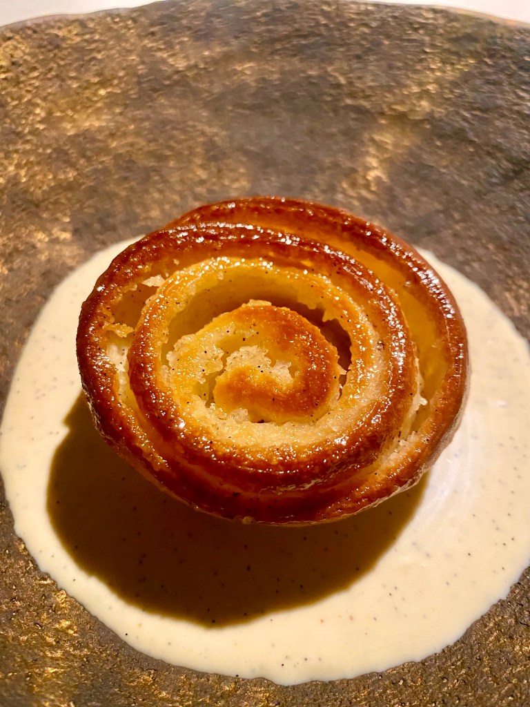 Del que no albergó una duda es de la tarta di rose y mucha vainilla, un delicioso y crujiente pastelito que participa de nuchas cosas que me encantan: brioche caramelizado, kougi aman, hojaldre, etc. porque a todo eso me ha recordado. La vainilla delicada y deliciosa.