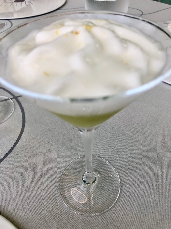El menú para este verano mantiene algunas cosas del de invierno, reinterpreta y mejora otras y añade algunas nuevas. Antes de ir a la mesa, tomamos un cóctel (un perfecto Gin Fizz, para decirlo todo) con muy buenos aperitivos: el canapé de pollo usa su piel crujiente como base y descompone un pollo asado en diferentes texturas