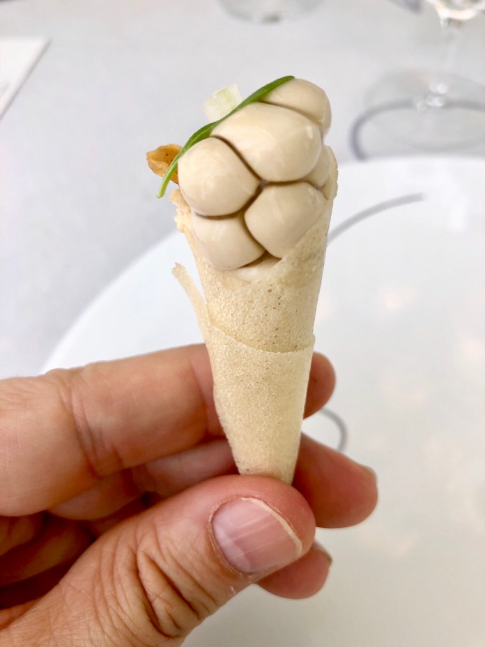 Ya saben que me encanta el ajoblanco y que, con el gazpacho, me parece la gran sopa fría del mundo. Roncero lo recrea constantemente. Ahora ha jugado más que nunca con texturas, temperaturas y alardes técnicos, realizando un espléndido sándwich de ajoblanco a base de almendra, melón asado y yuzu transformados en helado, merengue y fruta. Sobresaliente.