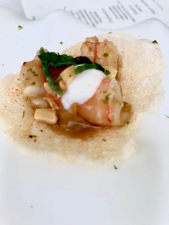 Y para seguir con lo crujiente, una suerte de pan de gambas para acoger un chispeante tartar de cigala en salsa americana con liliáceas y pesto de estragón.