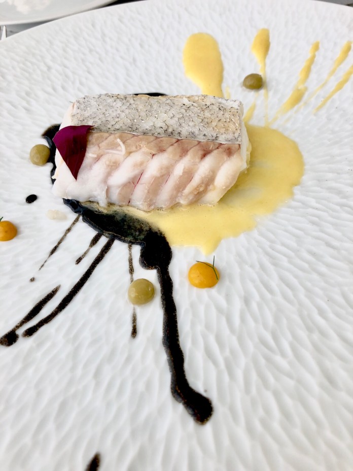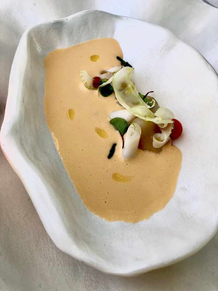 Y ya nos vamos a la mesa donde empezamos a disfrutar de la cercanía de las mágicas vistas y empezamos con otro clásico archicopiado, el huerto de Paco, miniverduras plantadas en tierra de aceitunas negras y una crema con algo de salsa tártara, coliflor, apio y nabo.