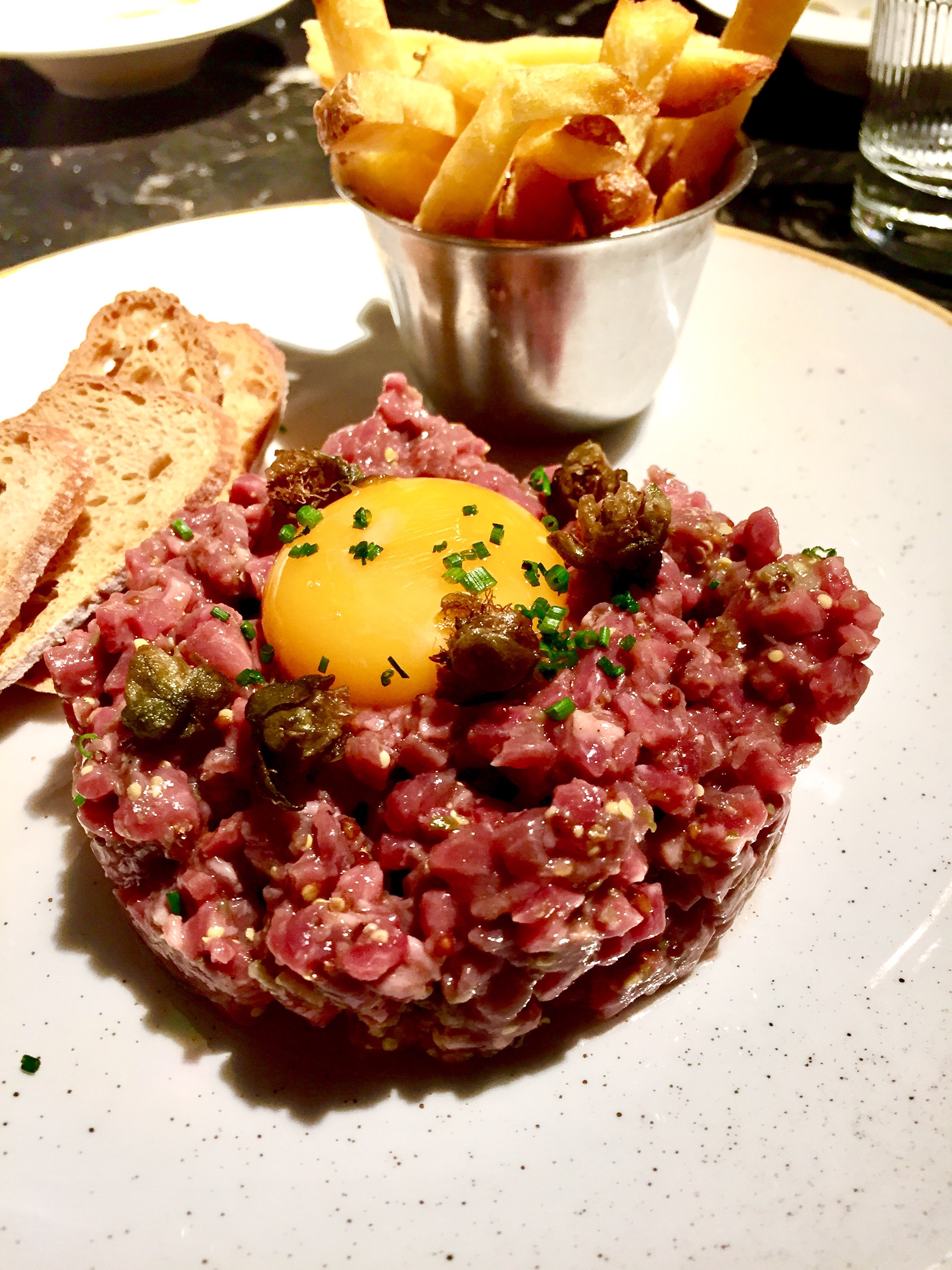 Casi lo mismo ocurre con el steak tartar que se sirve acabado de aliñar (una pena que se esté perdiendo la costumbre de darlo a probar antes de rematarlo) pero con la yema en el centro. Además de la mucha gente a la que no le gusta la yema cruda y tan rudamente exhibida, incorporada al final no acaba de mezclarse bien y, como a las setas, le da a la carne un toque demasiado viscoso. Una pena porque es muy buena y cortada a cuchillo. Hay que decir por cierto, que las carnes de Beristain son variadas y todas buenas.