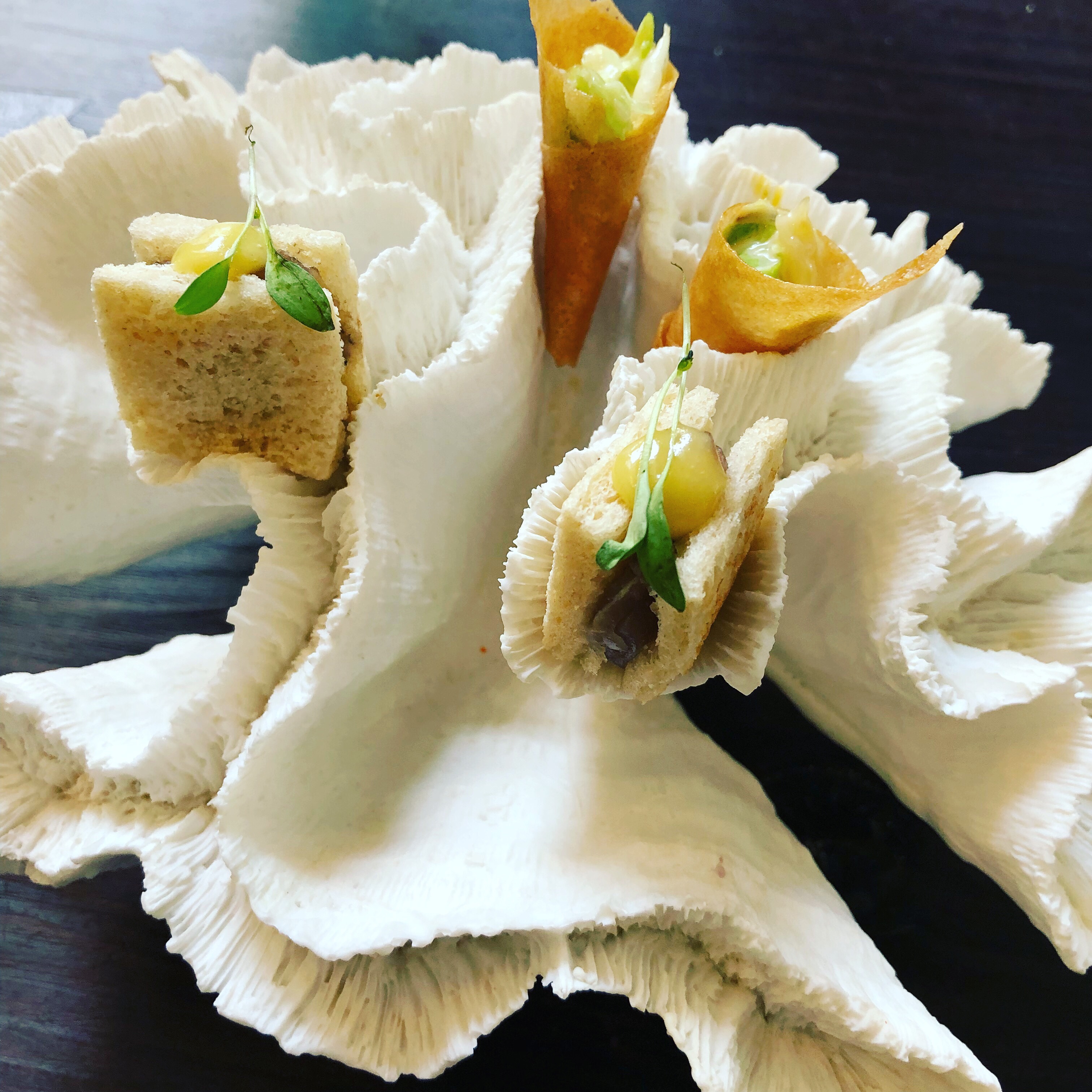 Llegan a la vez tres estupendos aperitivos. Las truchas, que en Canarias son las empanadillas, normalmente de patatas y dulces. Esta es salada y está rellena de un buen y especiado salmorejo canario de conejo (que es el más normal) y para decorar y poner lago de mar, una lámina de corvina con reducción de sus espinas. Muy buena y suave la empanadilla, espléndido y aromático el guiso.