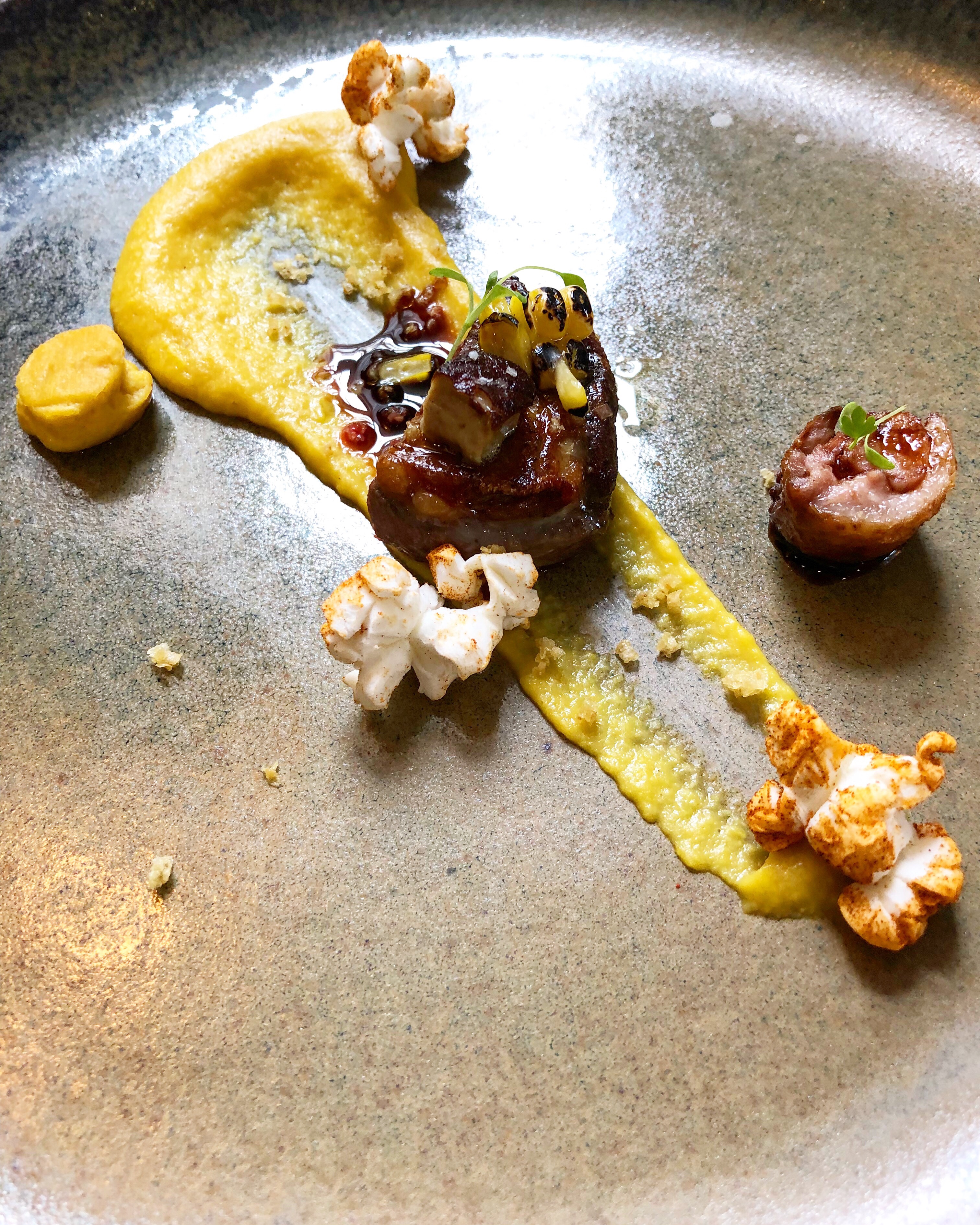 Paloma, foie y texturas de maíz es un plato agradable. Tiene más bien poco foie y buenas texturas, entre las que destaca el infantil atrevimiento de las palomitas y del maíz asado. Sin embargo lo mejor es la inclusión del dulzor de una crema de maíz que tan bien le queda a lo graso del foie y al fuerte sabor de la paloma.