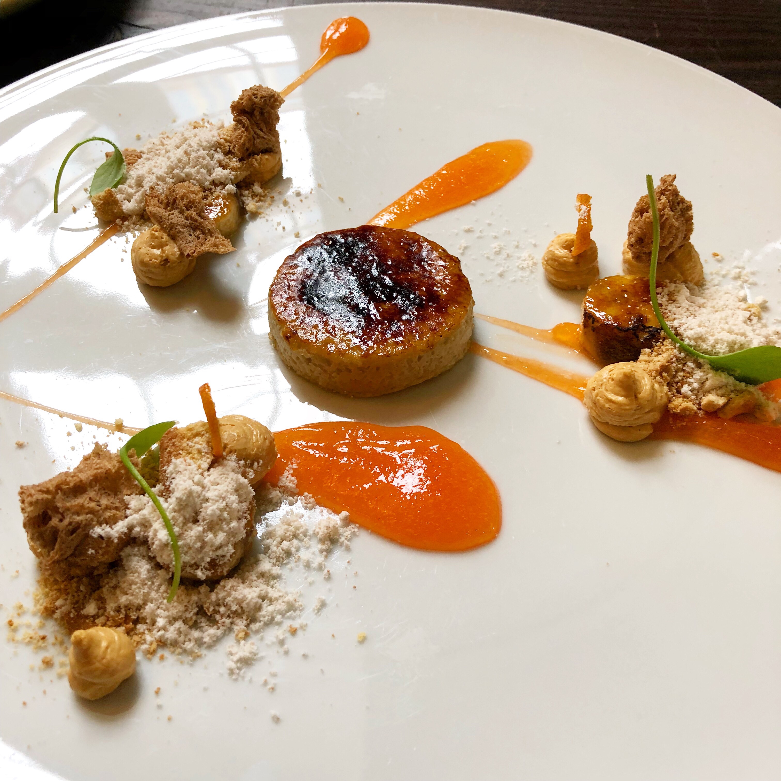 Plátano, naranja y galleta se compone de una crema fría de plátano con una costra de caramelo muy crujiente y un puré de naranja y calabaza con pedazos de galleta semisalada, que en España ahora todo el mundo llama crumble de galleta. Una agradable mezcla de sabores y texturas muy frutal y bien pensada.