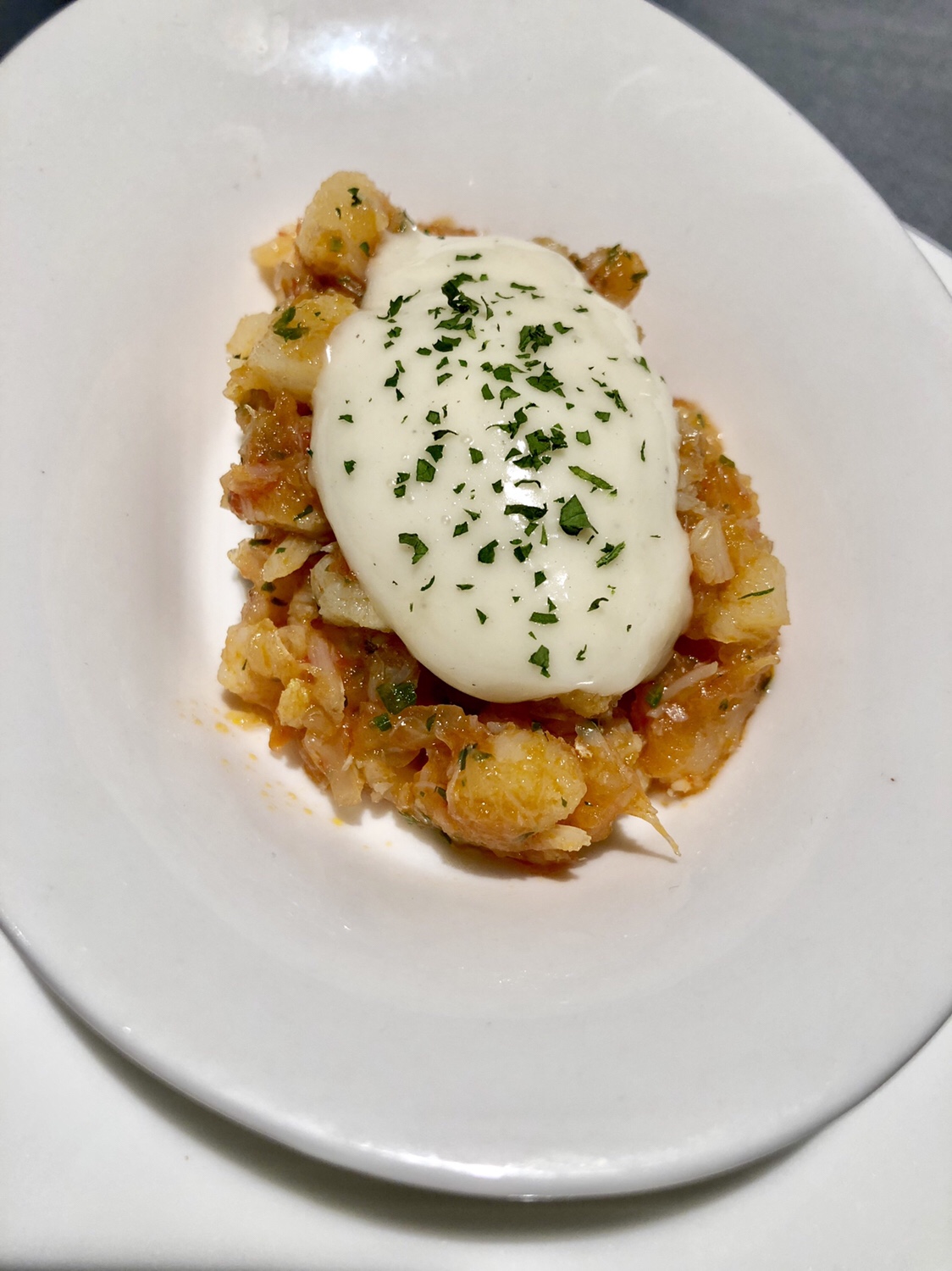 En el fondo del plato, una sabrosa y clásica bisque, aireada y espumosa, y una base de patata machacada y ahumada, guarida de pequeños trozos de bogavante y, sobre ella, otros pedazos más suculentos y, ¡oh cielos!, el mejor huevo escalfado de mi vida. Perfecto de forma, suave, brillante y con la clara completamente cocida y la espesa y dorada yema, suelta, semilíquida y templada. Parece fácil pero, créanme, los pido mucho y pocas veces están buenos.