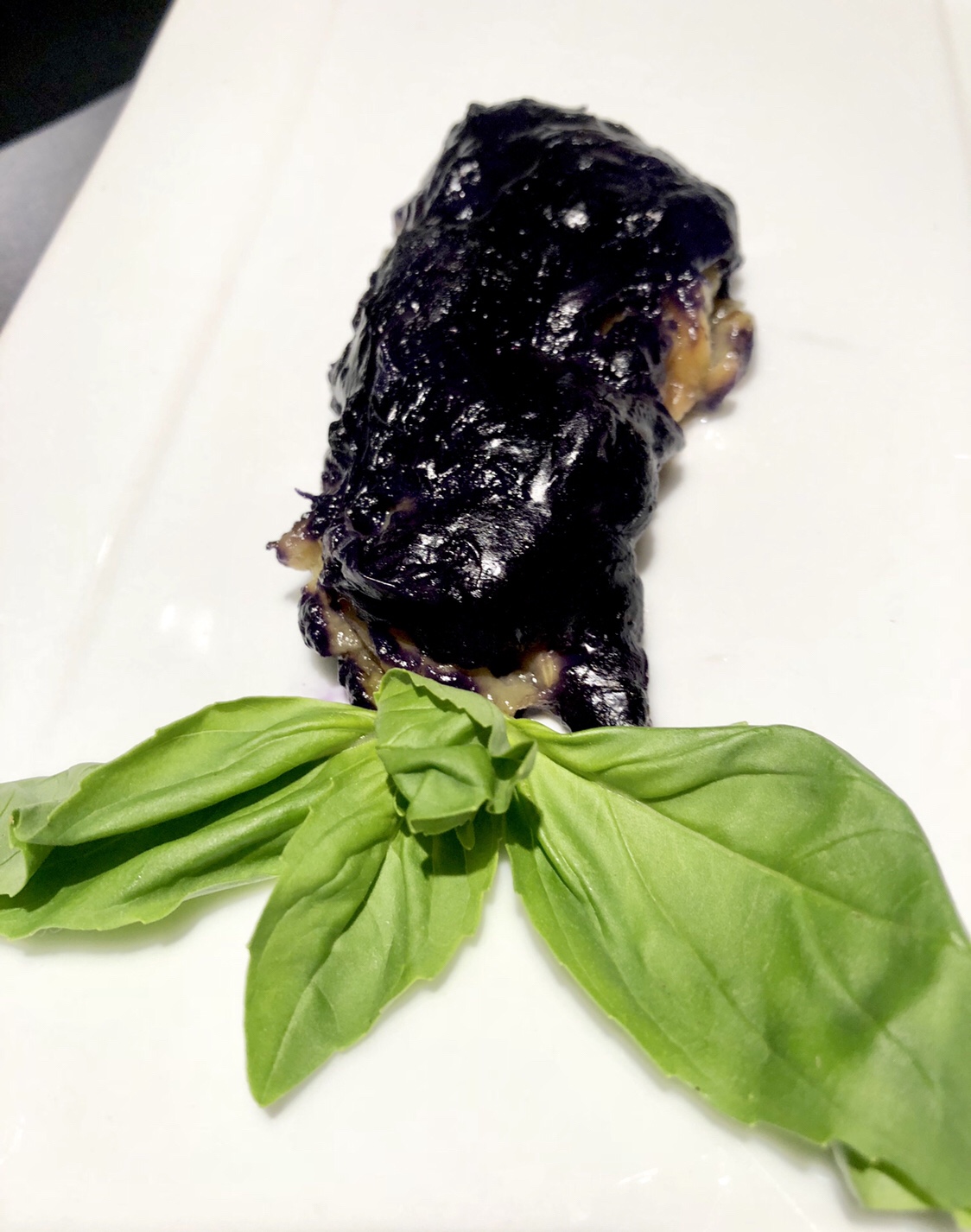 Ese era su único acompañamiento pero no me resistí a innovar y le pedí la berenjena rellena que sirve con la presa. Buenísima. Rellena de cebolla, demasiada, y queso.