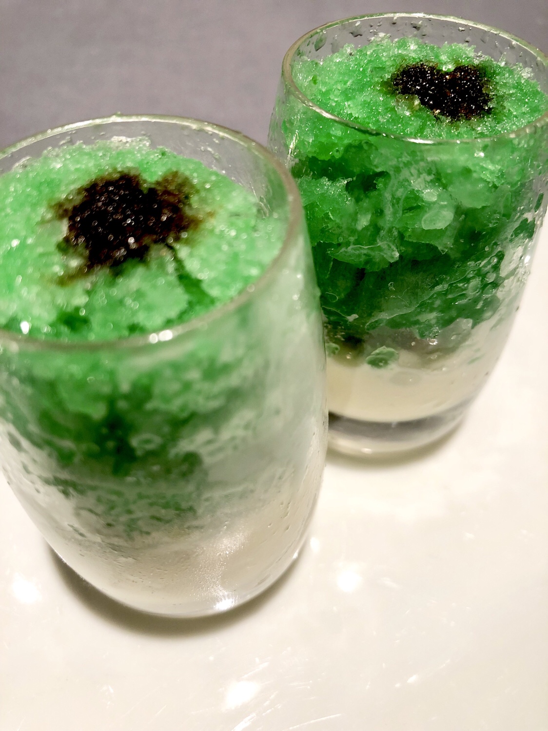 Antes del postre unos buenos y refrescantes chupitos de manzana verde, crema pastelera y un toque de regaliz.