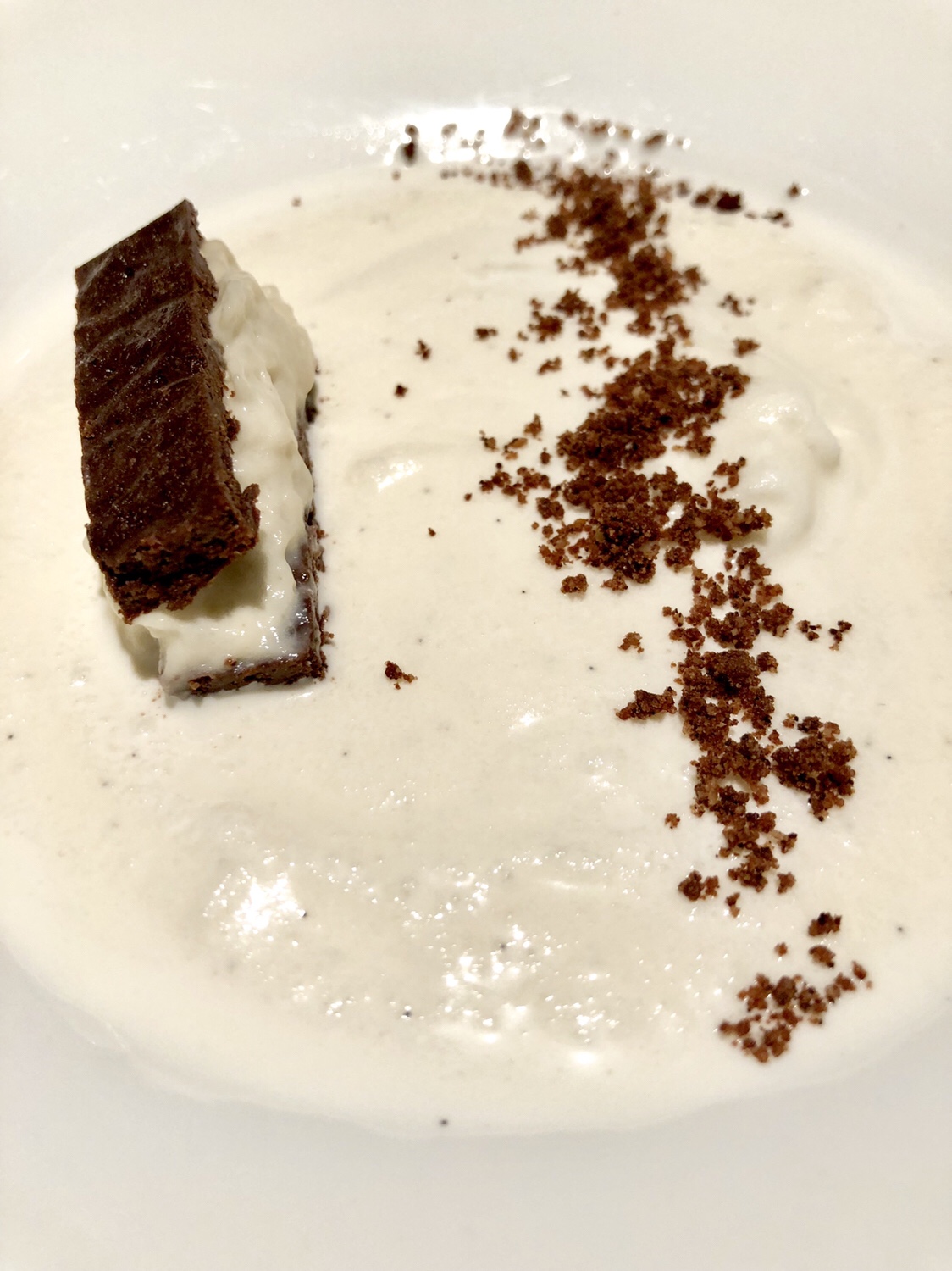 Y para acabar, crema de vainilla con galleta de café y plátano, todo bueno y agradable pero nada como la crema fría -con consistencia de helado batido- que es pura vainilla, fuerte y aromática.