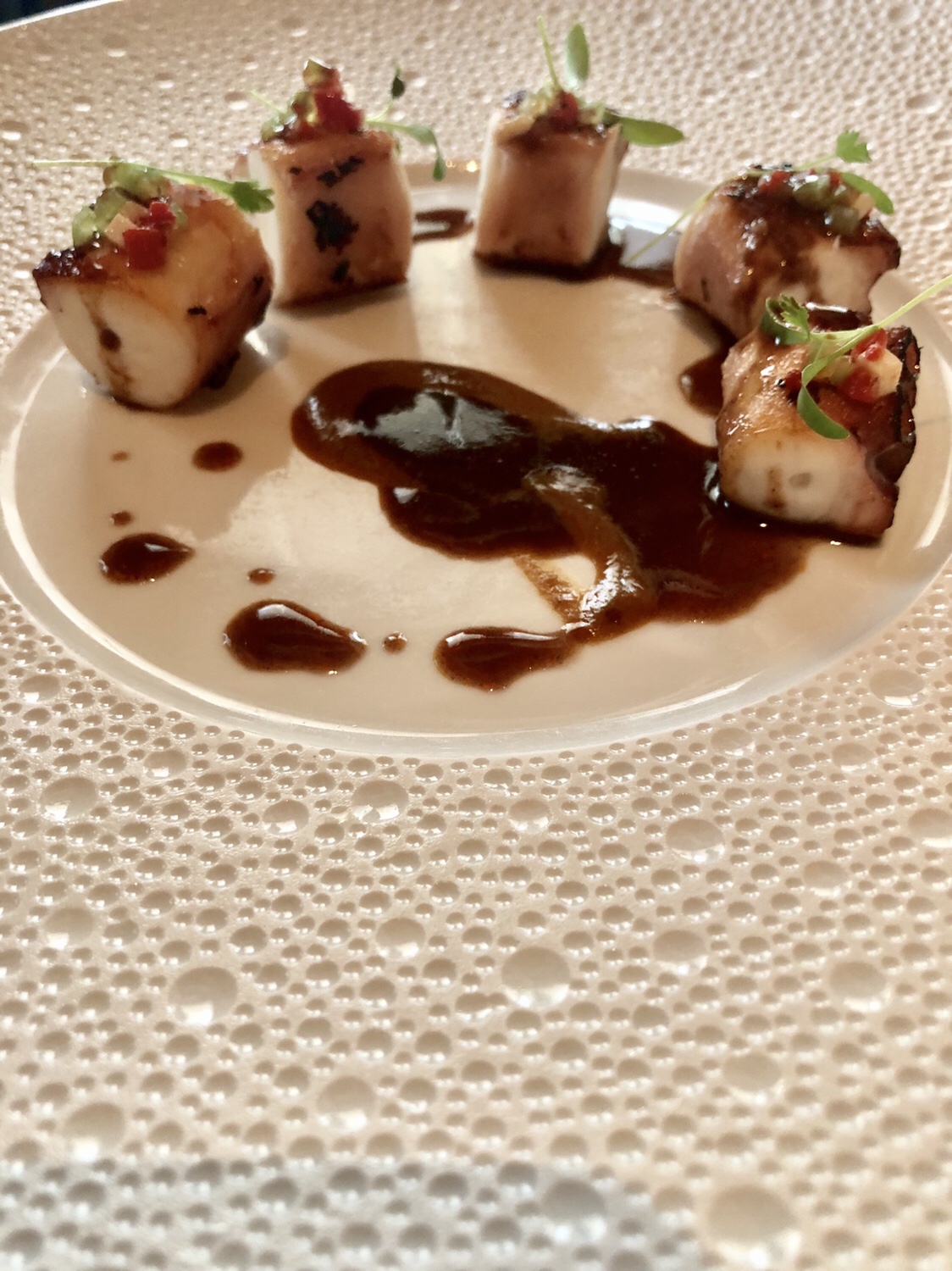 El buñuelo de panceta juega con los recuerdos de un buñuelo de chocolate aunque no lo es. El panecillo de trigo al vapor se rellena de panceta y se rocía, y este el culmen del plato, con una salsa densa y golosa con algo de dulce. Como se come con la mano, pedí una cucharilla, porque tanto sabor era de aprovechar.