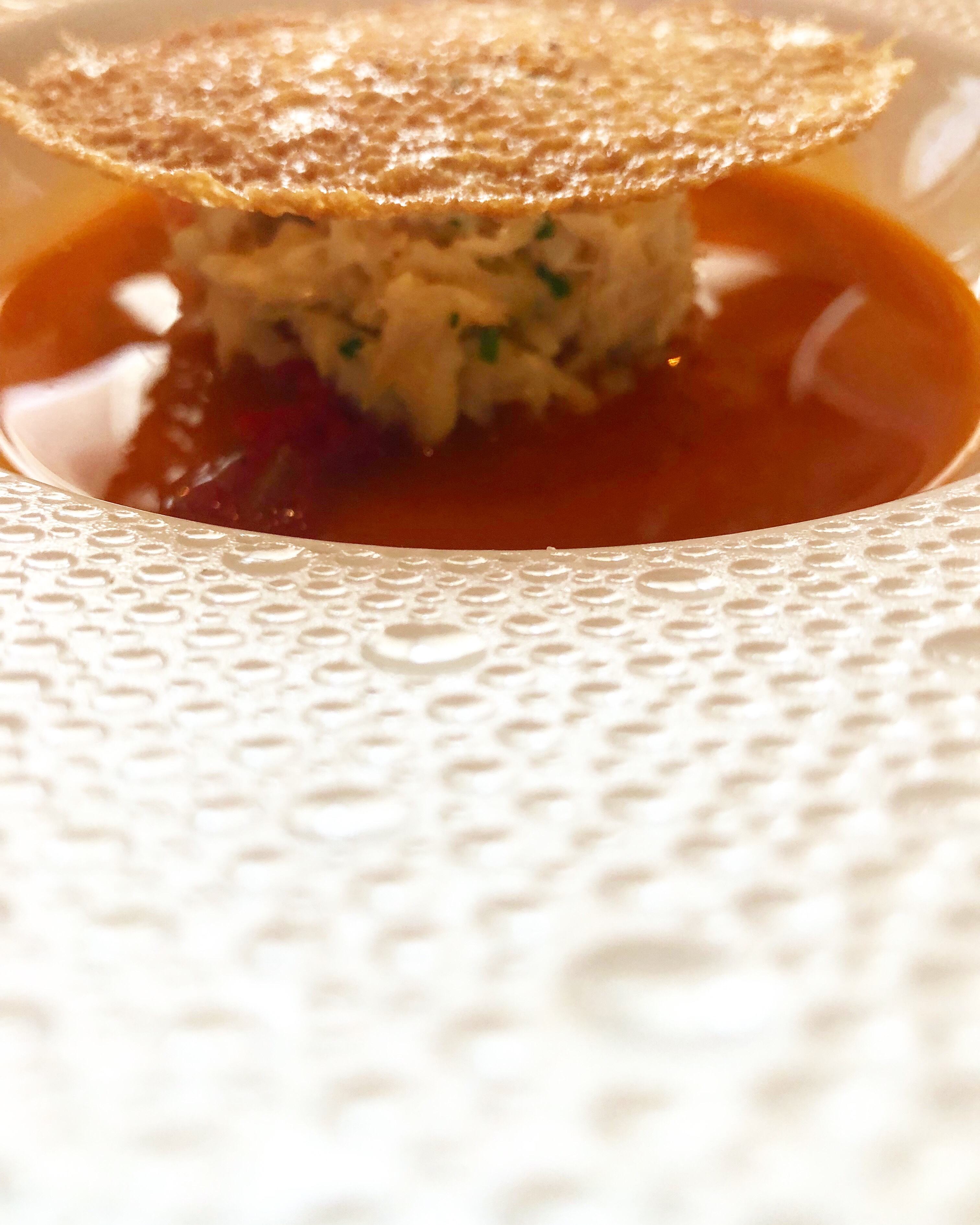 El pastel de cangrejo es mucho más espectacular de lo habitual porque reinventa la densa receta americana. Se trata de cangrejo desmigado y colocado bajo un velo crujiente que le da consistencia. Para rematar, un buen caldo de cangrejo y cardamomo.
