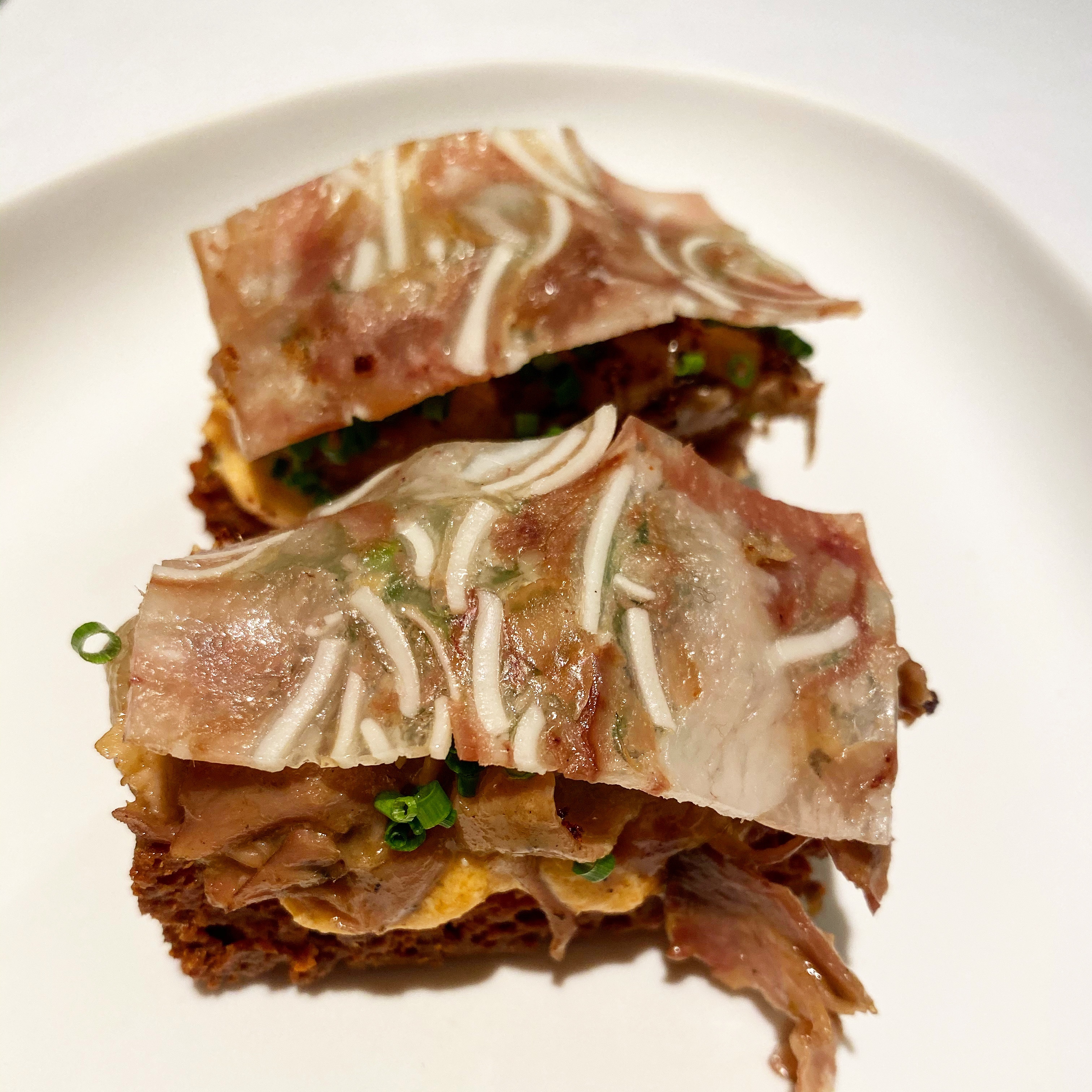 El bocadillo de pata asada con pan de Matalauva, tampoco se queda atrás. Sobre una crujiente corteza de pan, un buen guiso de pata de cerdo cocinada muy lentamente y después desmenuzada y una loncha del fiambre de la pata que me ha recordado a los chicharrones que vendían en muchas charcuterías antiguas.