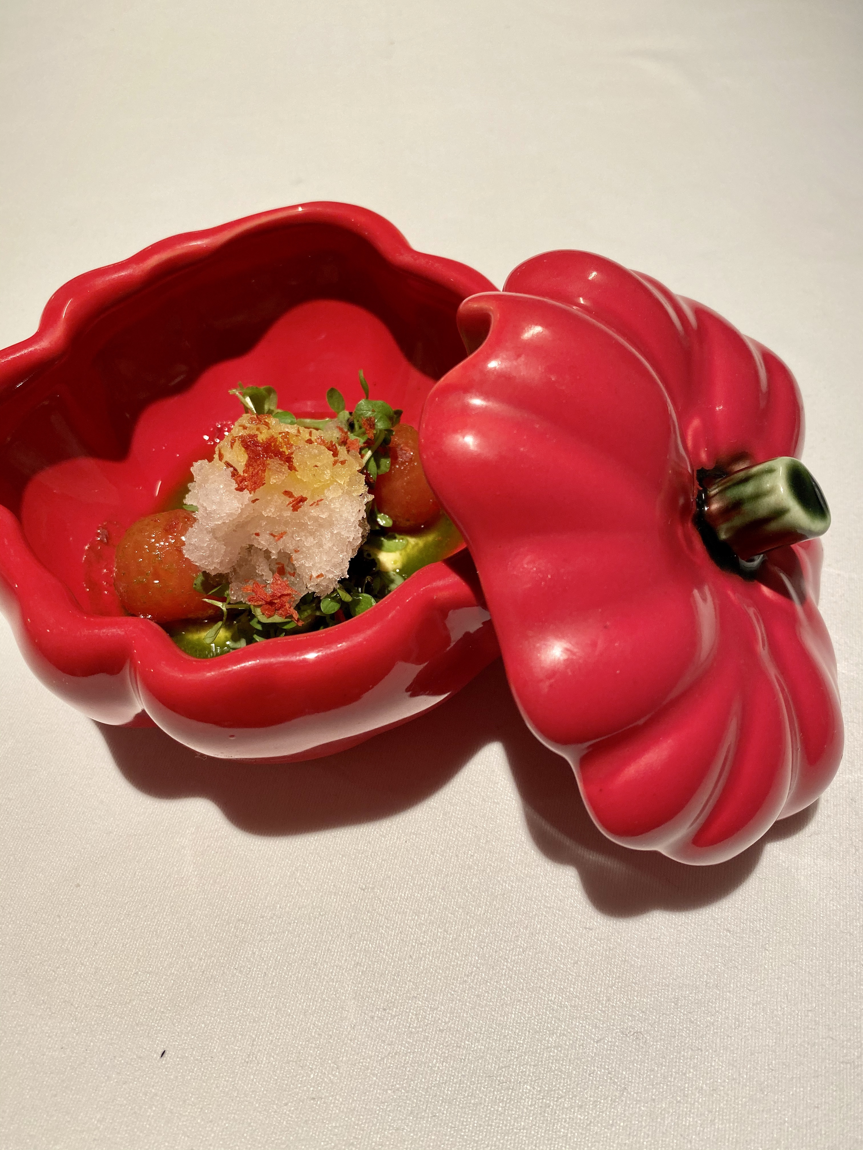 Ya todo sucederá en una de las bellas mesas de los tres comedores y empezará por los frutos secos. Sopa fría de almendra con agua de chufa y curry verde que además lleva unas falsas almendras y perlas de Palo Cortado. Tenemos en la mesa un cacahuete y una avellana de loza que ya podemos abrir. Contienen granizado de maíz tostado, cacahuete con aguacate y jalapeños y un salmorejo lleno de aromas de kimchi con romescu de avellana y escarcha de agua de tomate. Una combinación única.